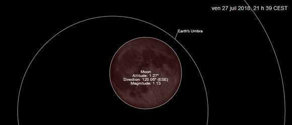 L'éclipse lunaire aura déjà commencé quand la lune se lèvera à 21h28. Le maximum commence à 22h21.
