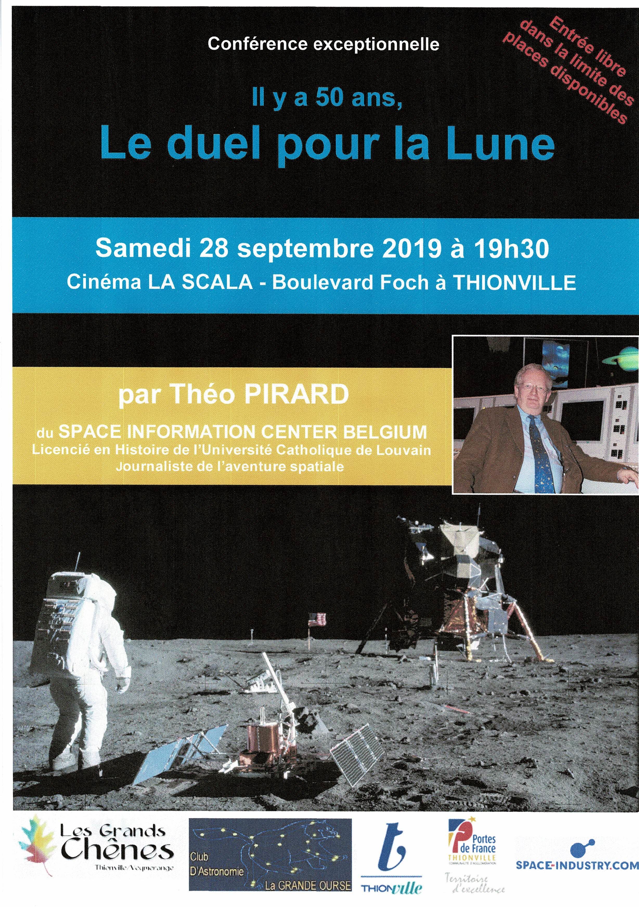 Le 29 septembre à 19h30 au cinéma Scala, boulevard Foch à Thionville: Conférence exceptionnelle " Il y a 50 ans, le duel pour la Lune " par Théo Pirard du Space Information Center Belgium, historien et journaliste de l'aventure spatiale.