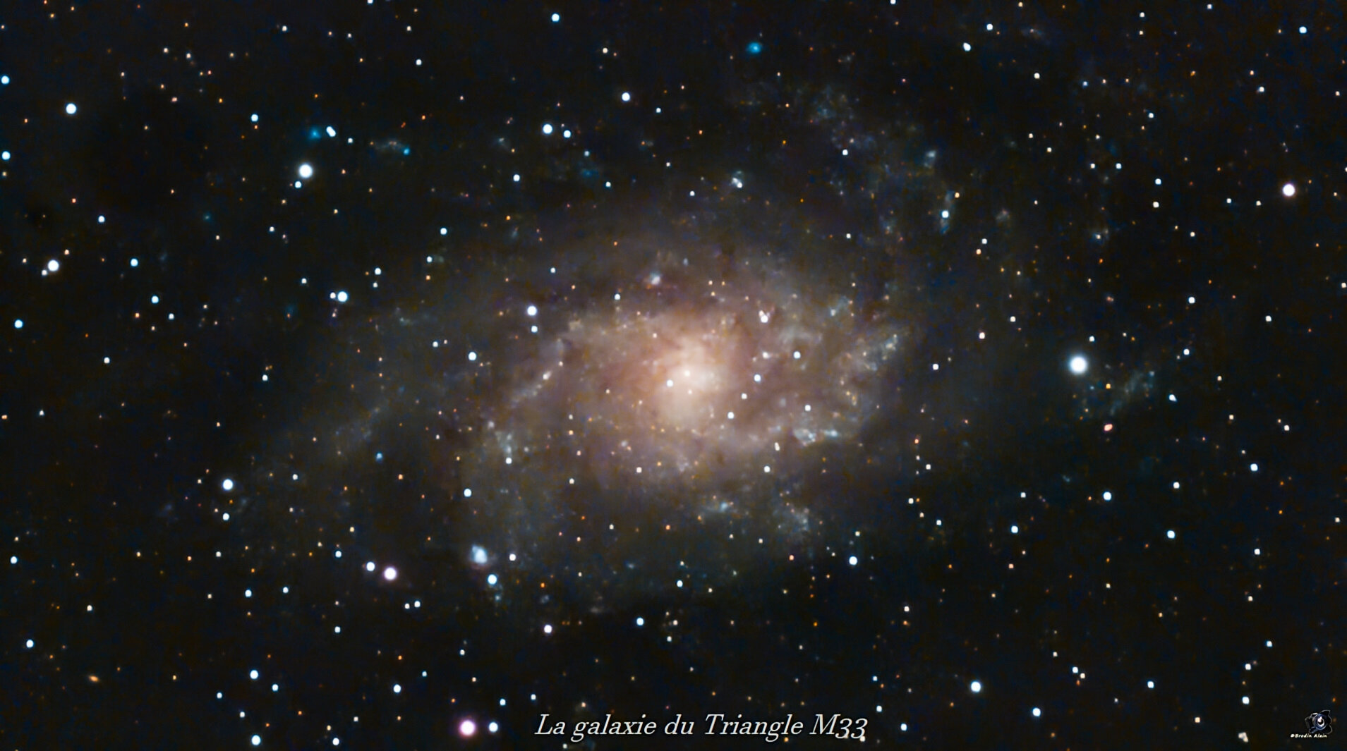 La galaxie du Triangle M33 du 24 09 2023 , 119 photos empilés sous Siril + 20 Dark , pose de 60s , Gain a 131 , Lunette 72ed sur Heq5 goto + CCD Zwo 385Mc , pilotage Asiair Plus . Traitement LR / Photoshop / Photodirector 365 .
