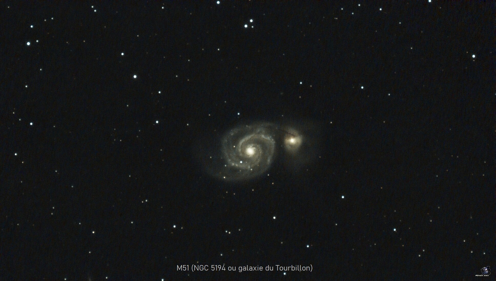 M51 , 72 images compilés + darks , 30s gain à 131 , ccd zwo385 mc sur lunette 80ed + reducteur 0.8 + filtre anti pollution sur Heq5 goto + Asiair Plus pour le pilotage avec la tablette le 07 06 2023