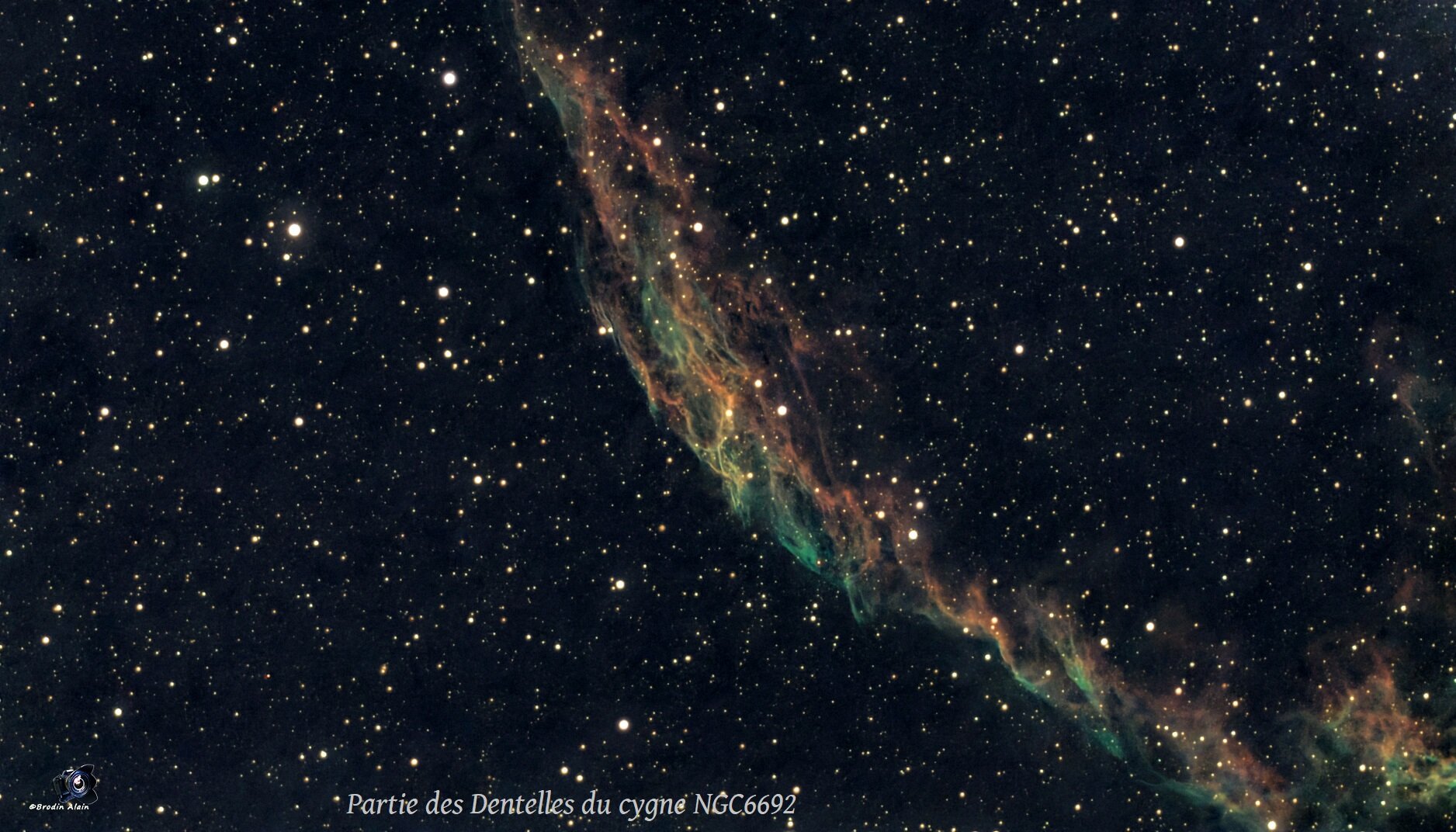 Un morceau des dentelles du cygne NGC 6992 ( dommage que j'ai mal cadrer ) 116 photos de 30s gain 131 ccdZwo 385 mc , lunette 72ed + reducteur 0.8 sur heq5 goto + filtre uhc prise le 24 06 2024 . J'ai refait ma NGC6992 retravaillé en utilisant les deux partie starLess et starRéduction sur siril puis assemblé sur photoshop et retraité avec photodirector 365