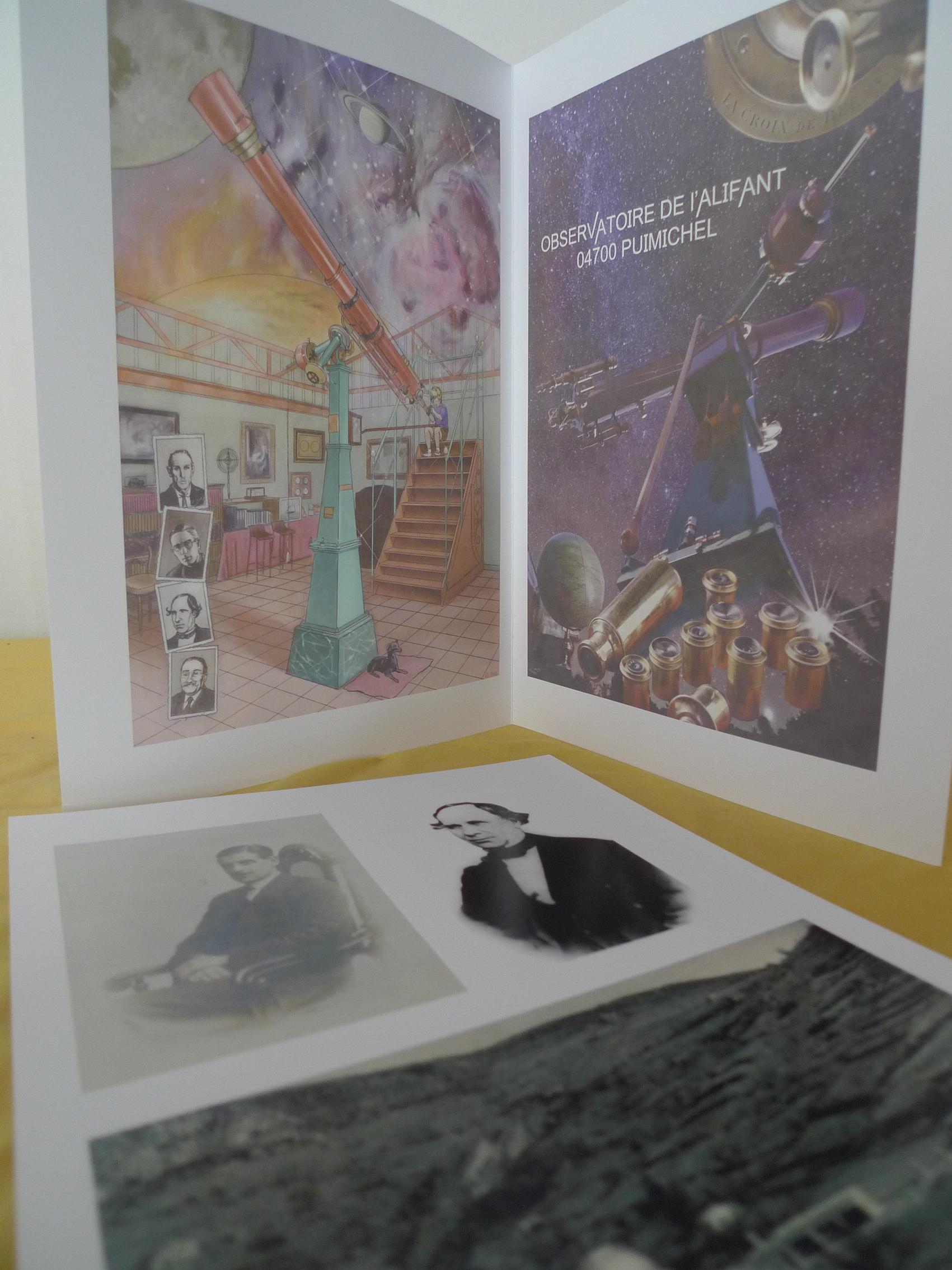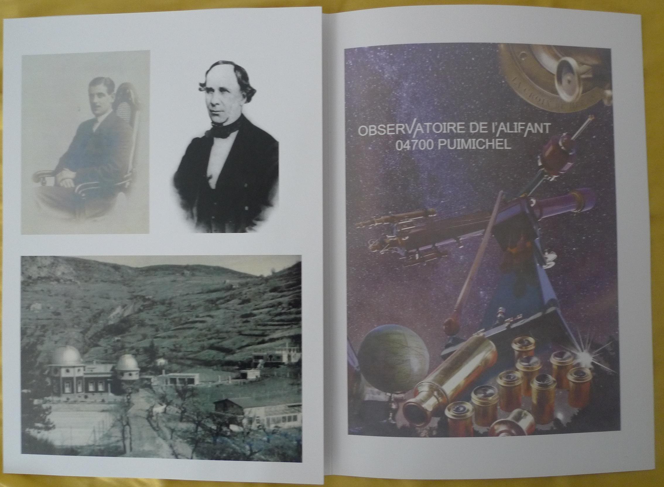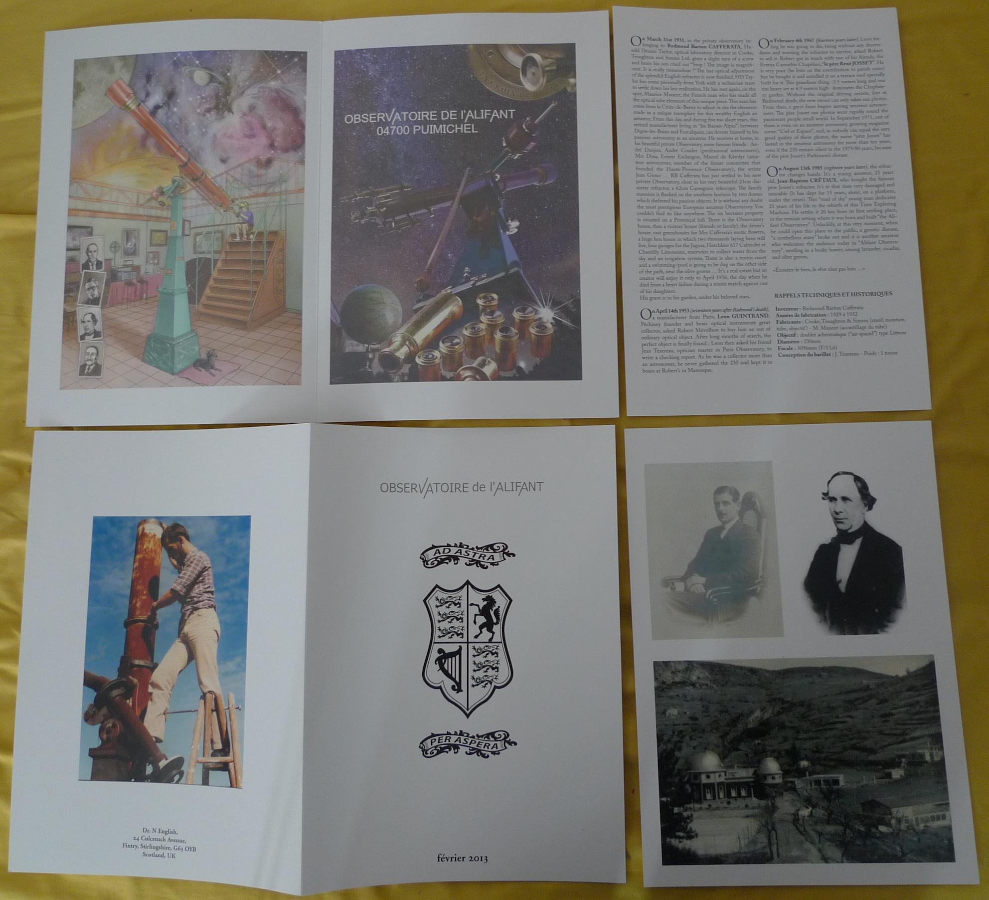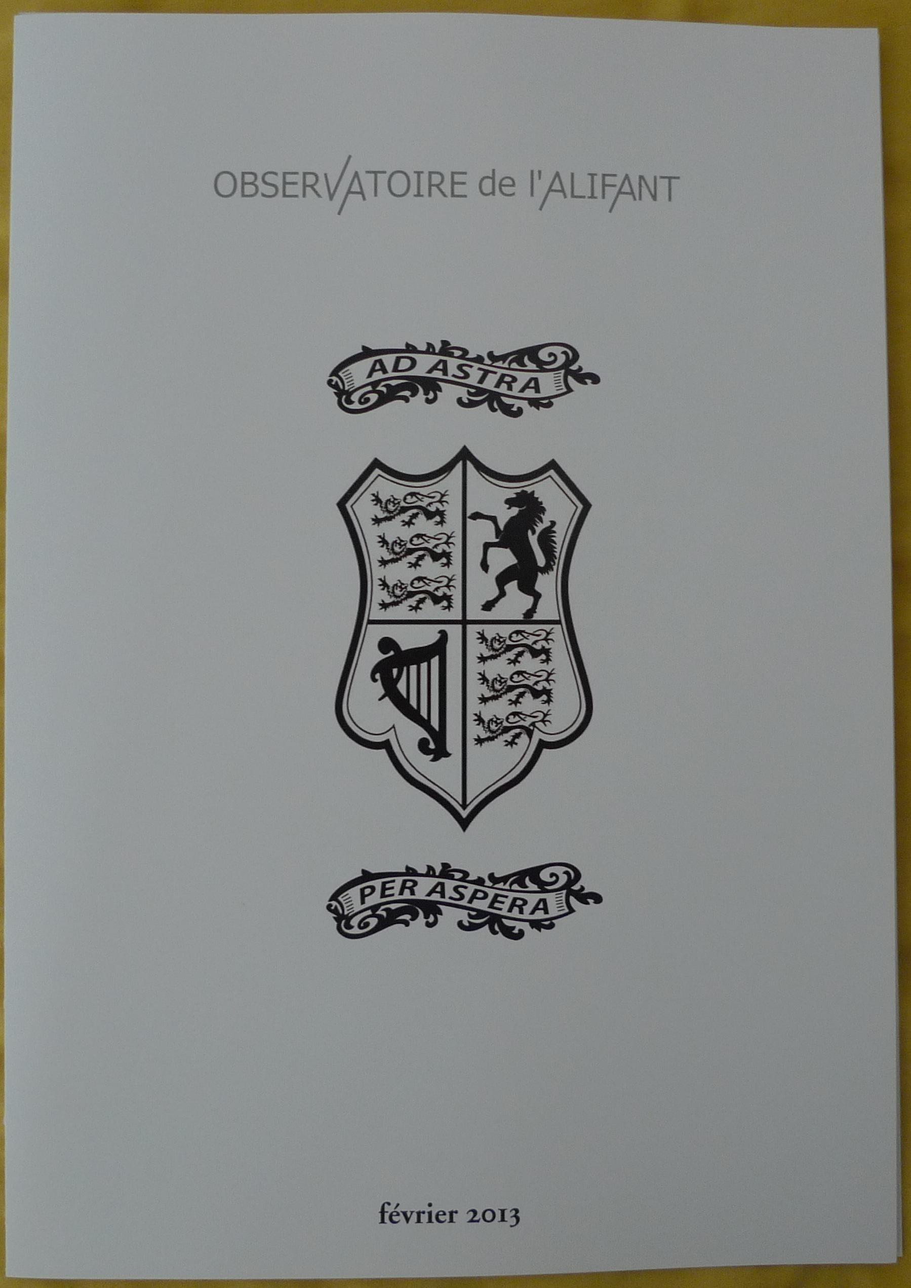 La fabrication est terminée. Voici ce que j'envoie demain au Dr N. English (sacré nom pour un scottish !!!). J'ai fait imprimer, en 2 exemplaires, un doc plié, environ A3, 90g couché brillant. Au recto, on voit le blason de la famille Cafferata dans lequel j'ai fait inclure la devise latine de l'obs Ad astra, per aspera. La police observatoire de l'Alifant est celle créée par Redmond en 1920, redessinée entièrement lettre par lettre par Bill. En face, une photo couleur du démontage en 85 où on voit l'état de la 230 au moment de sa découverte par René et moi. À l'intérieur, pleine page, en quadri descendue l'affiche Lagorce et l'affiche Bill. En feuillet A4 90g, séparé, le texte, et, au dos Redmond, Thomas Cooke et l'observatoire de Redmond en 1935, à 20km de chez moi.