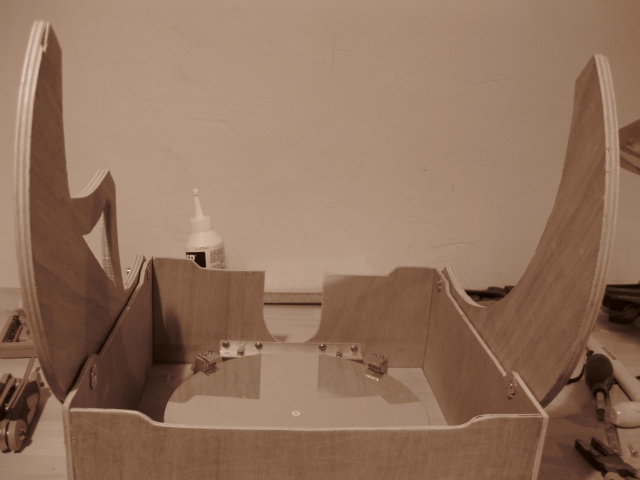 Bon va falloir que je réfléchisse, pour les fixations basses des tiges (que je n'ai pas encore...), j'ai l'impression qu'il n'y a pas la place dans les coins supérieurs de la caisse : Le trou de fixation des haches étant à 30mm du bord, et l'écrou frappé faisant 13mm de diamètre, il ne reste que environ 17mm...