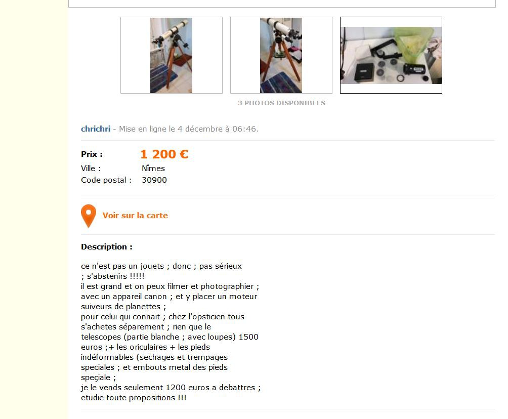P.S. : au départ, ce fil repère les annonces où le prix est exagéré (plus cher que le neuf), où les qualités du matériel sont vantées de façon exagérée (le célèbre "télescope professionnel" qui est en fait une lunette d'initiation), où l'ignorance du matériel est criante (le newton monté cul par-dessus tête), etc.