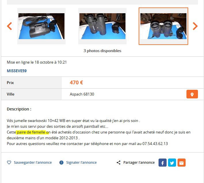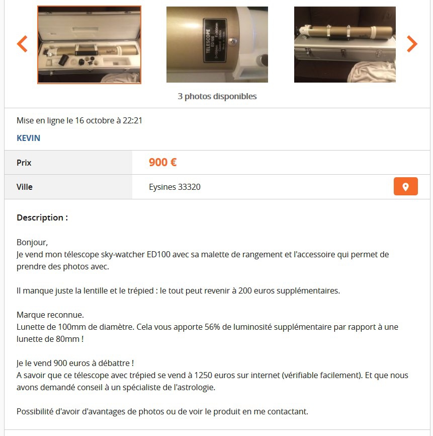 J'habite la même ville que le vendeur... je l'ai contacté à l'instant pour voir s'il est prêt à descendre son prix sachant qu'il manque le chercheur, l'oculaire et le renvoi coudé par rapport à une lunette équivalente neuve.