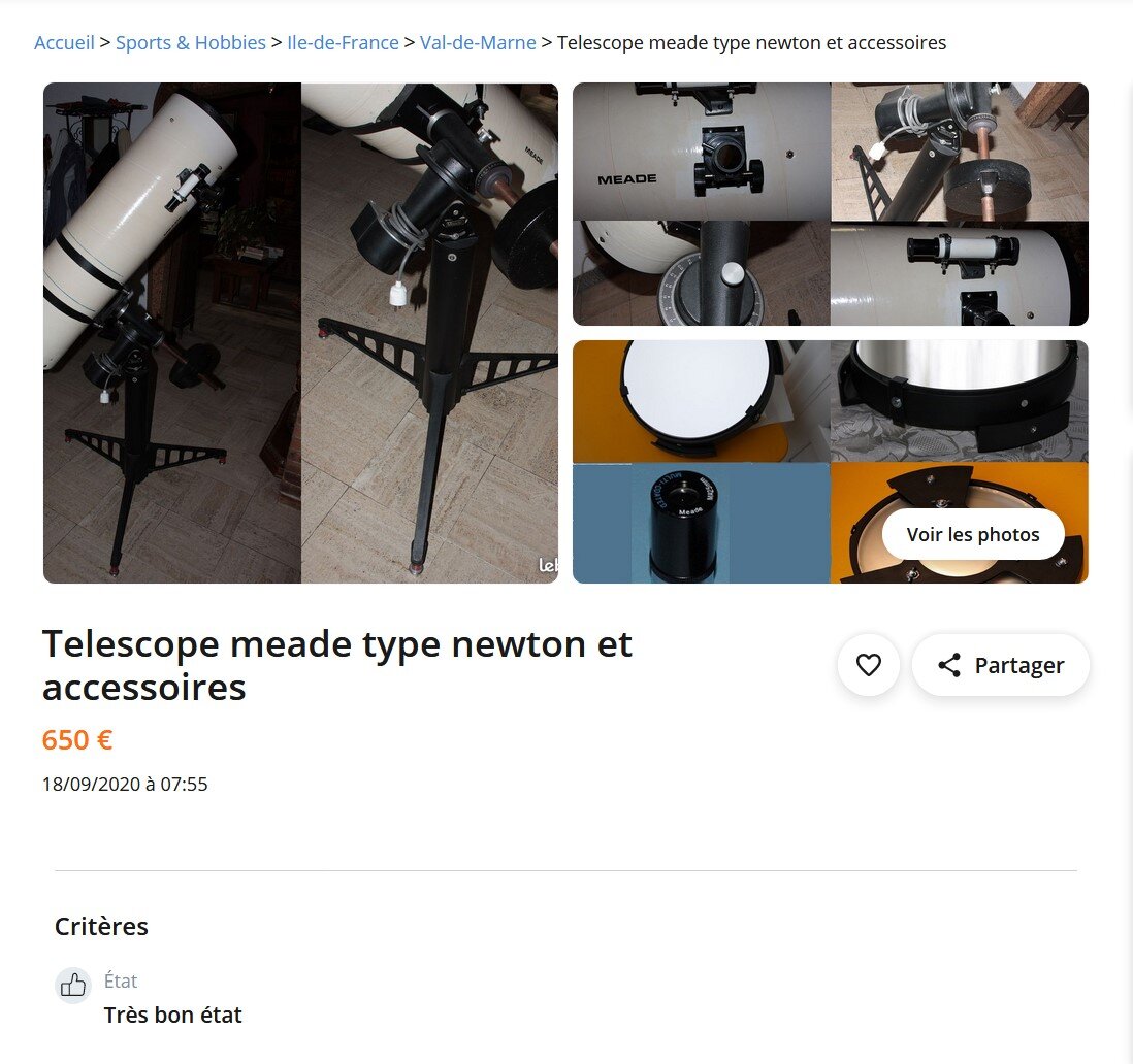 Oui, cela coûtait 25 000 Frs à l'achat environ, mais là il s'agit de la version LX200 standard, traitement EMC, avec l'ancienne raquette à 64 000 objets. Un matériel qui n'existe plus depuis 16 ou 17 ans, avec plus aucun SAV existant et bonne chance pour trouver des pièces si besoin (ca se trouve toujours). Ce qui n'enlève rien à ses qualités de départ. Depuis, il y a eu les versions GPS, améliorées, un tube avec un nouveau traitement optique (UHTC) et les déboires supplémentaires de Meade. Bref, ca se négocie généralement au prix d'un tube SC 8" et d'un trépied qui est lui correct et réutilisable.