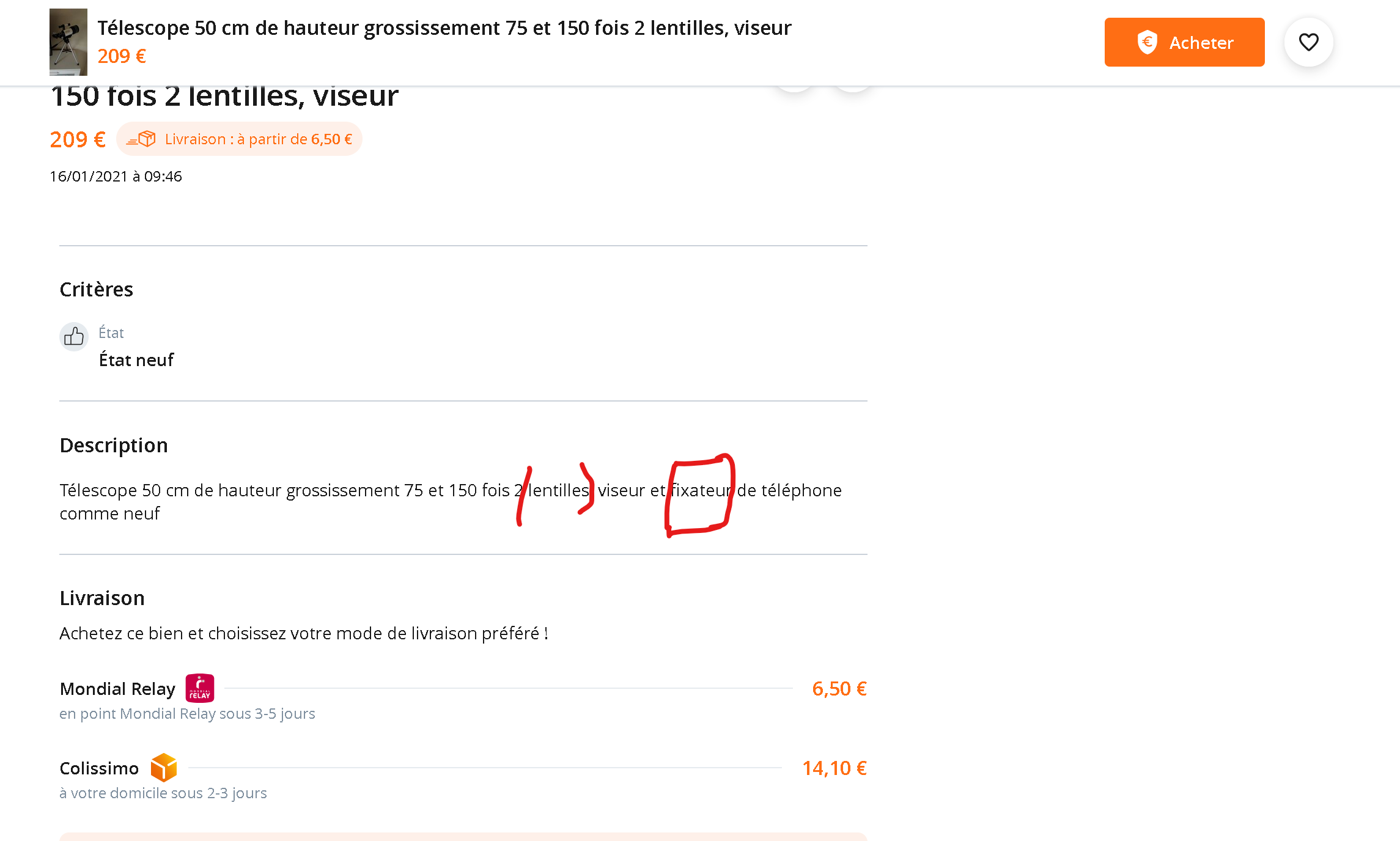 Un message pour vous alerter, j'ai failli me faire avoir sur une annonce du bon coin, mais comme les explications de la personne ne semblaient pas claires : j'ai fait une recherche par image sur le net et j'ai retrouvé le même télescope avec les mêmes photos et descriptifs sur une annonce en Australie.