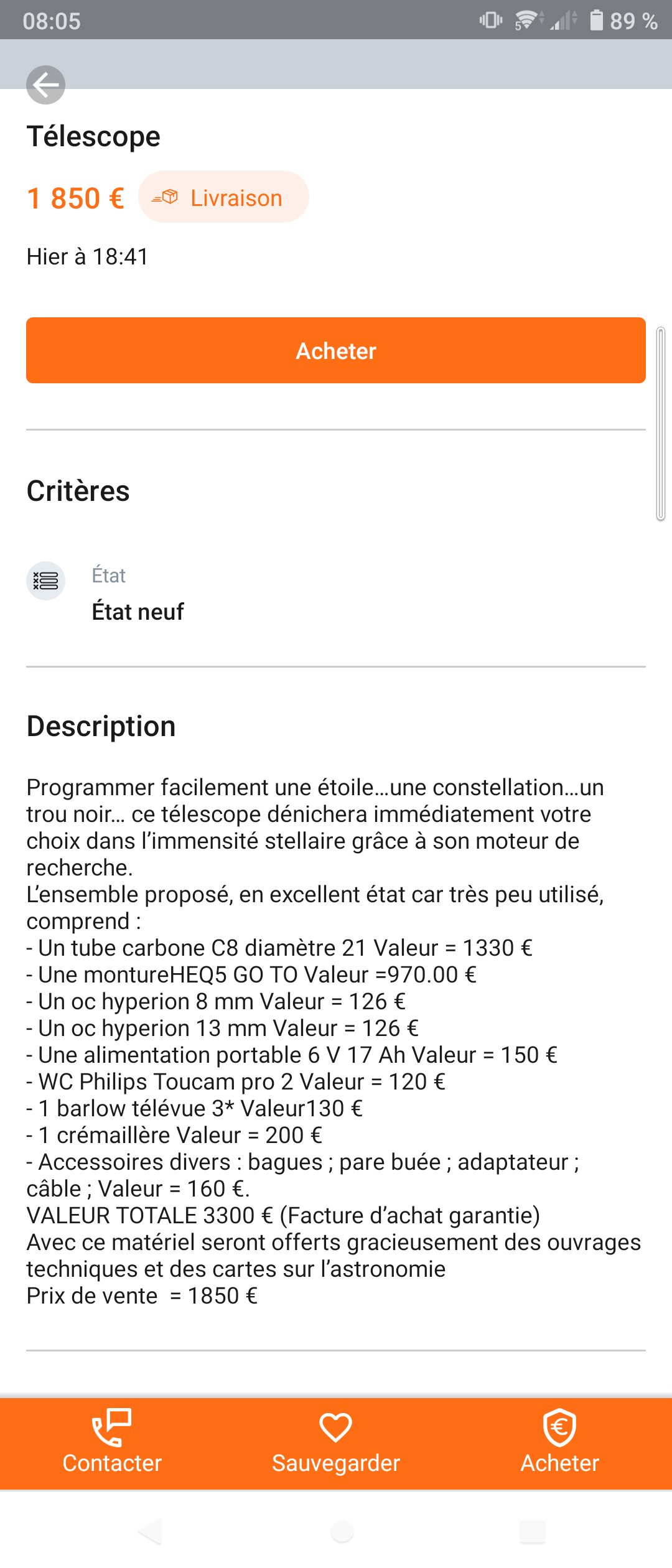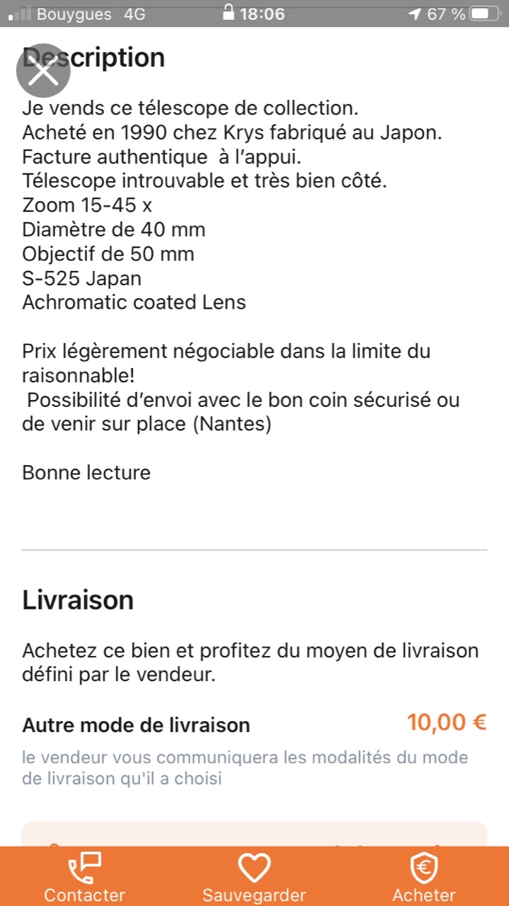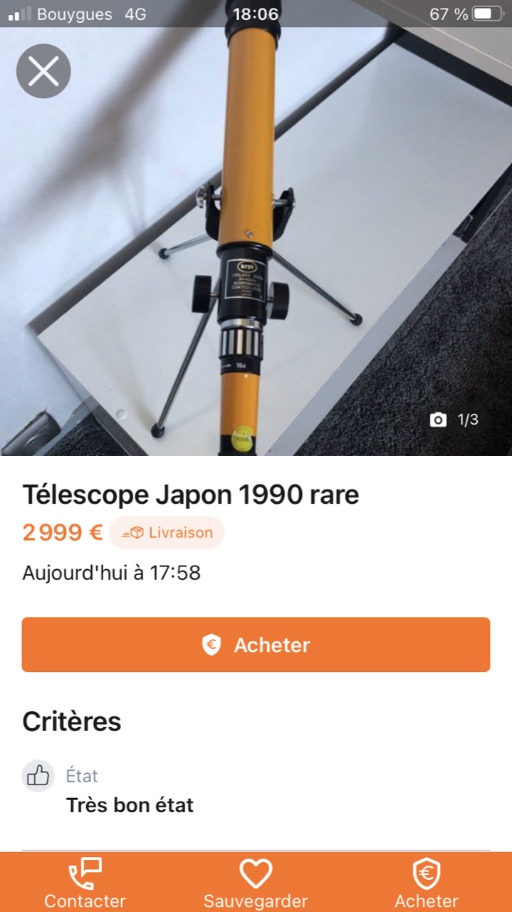 Un geste pour acquérir ce "telescope de collection introuvable et très bien côté" et "puisque le prix est légèrement négociable", je propose une très belle offre de 15,5 €