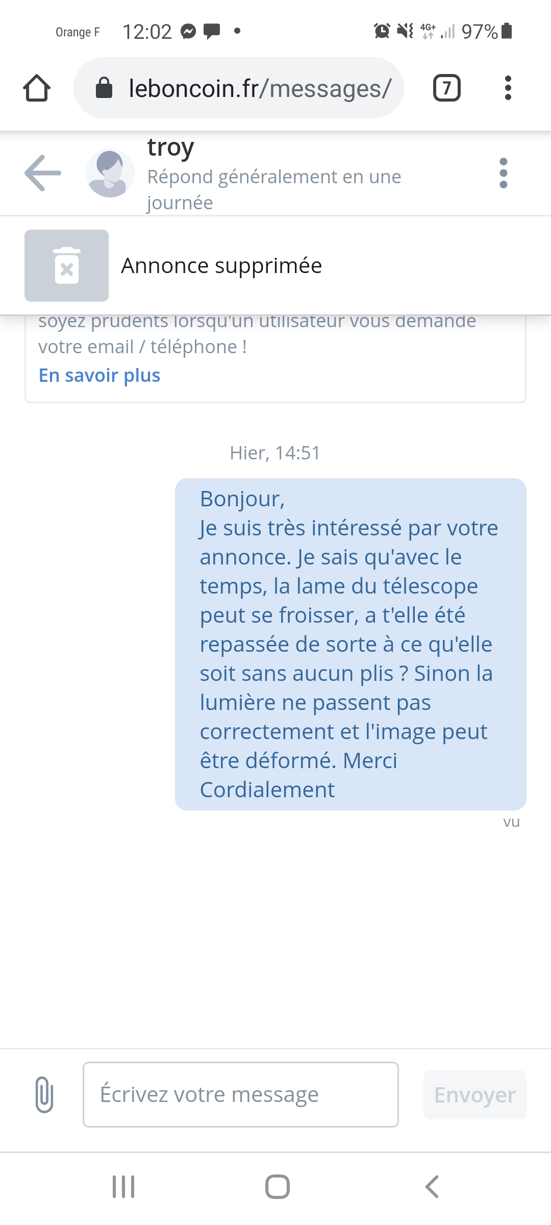 Oui c'est triste. Sur internet on voit de plus en plus d'arnaque... Mais sur Leboncoin c'est le pompon. Je n'ai plus aucune confiance en Leboncoin pour les annonces de scope entier.