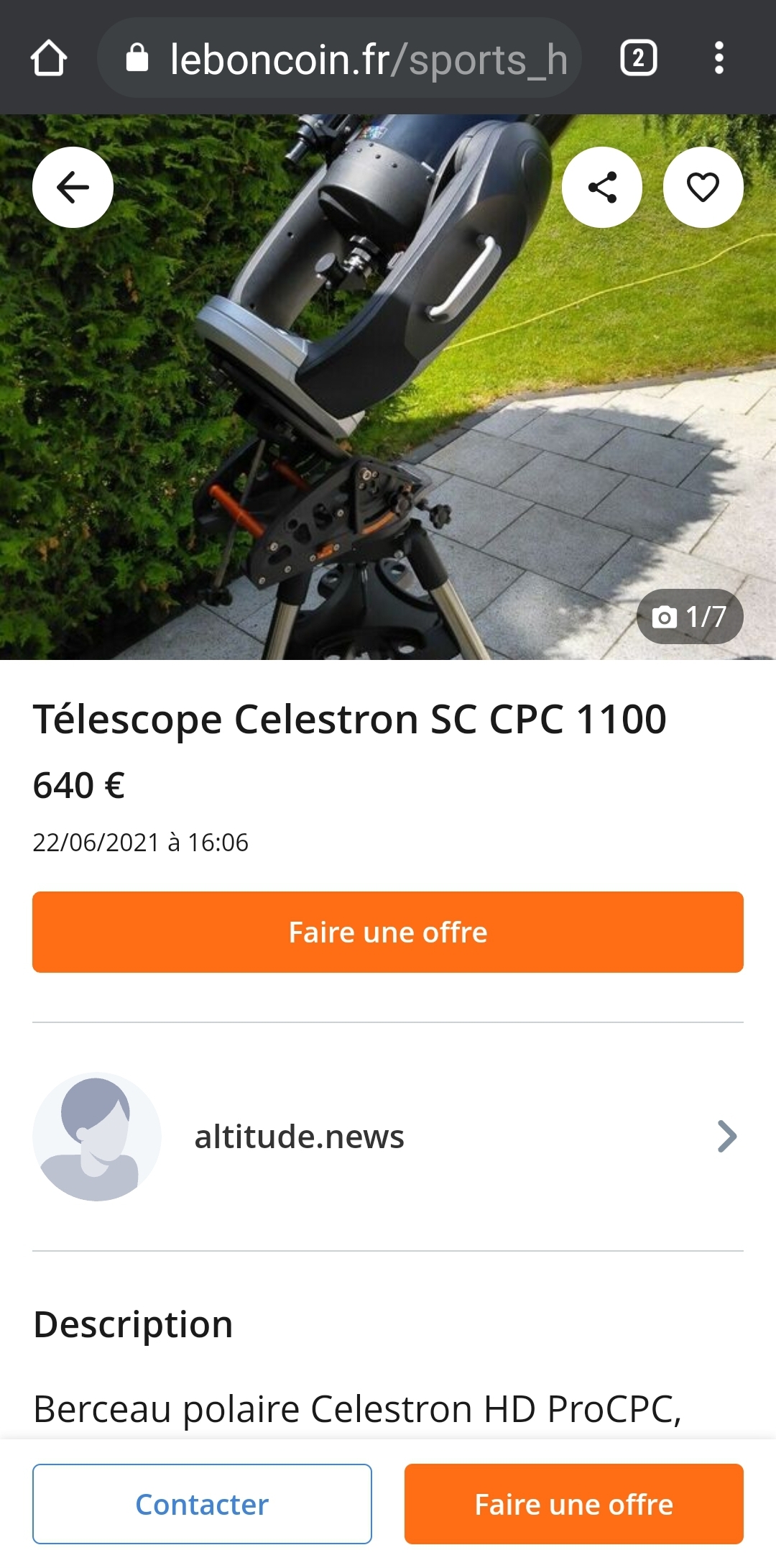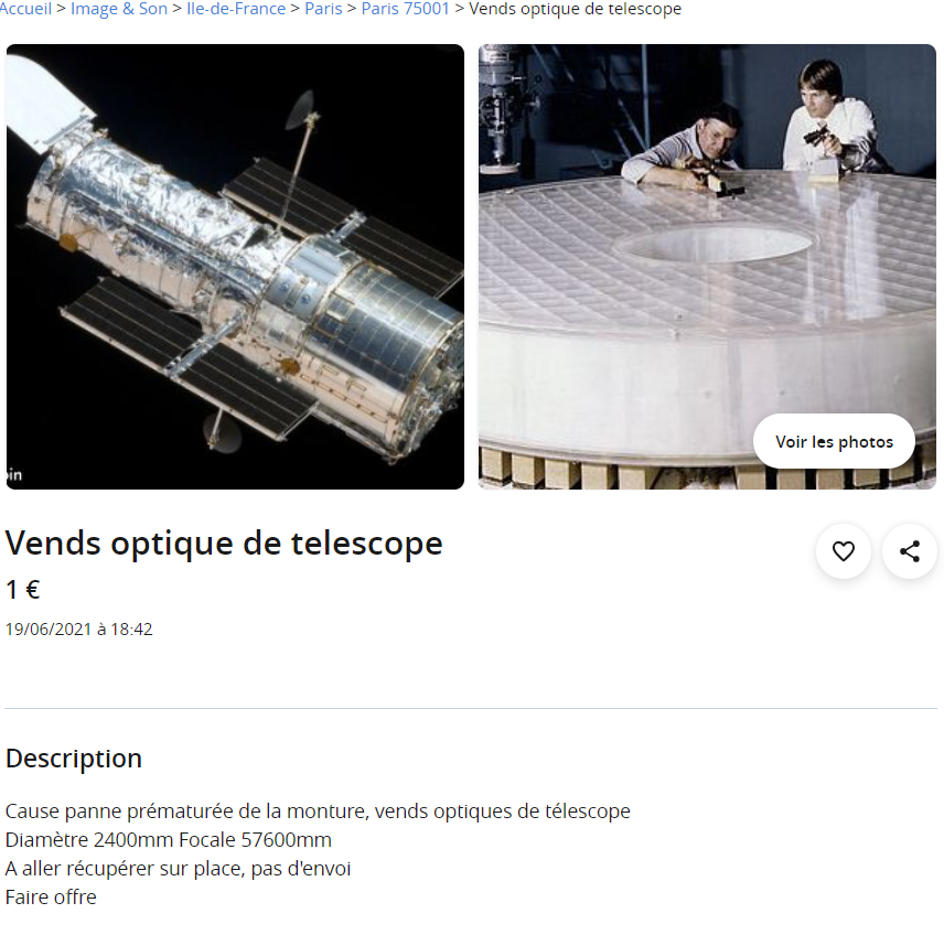 Avec la description des accessoires qui est un copié-collé de la fin des url de chez AstroShop je penche pour l’arnaque. En plus du télescope qui n’est pas un PDS sur la photo.