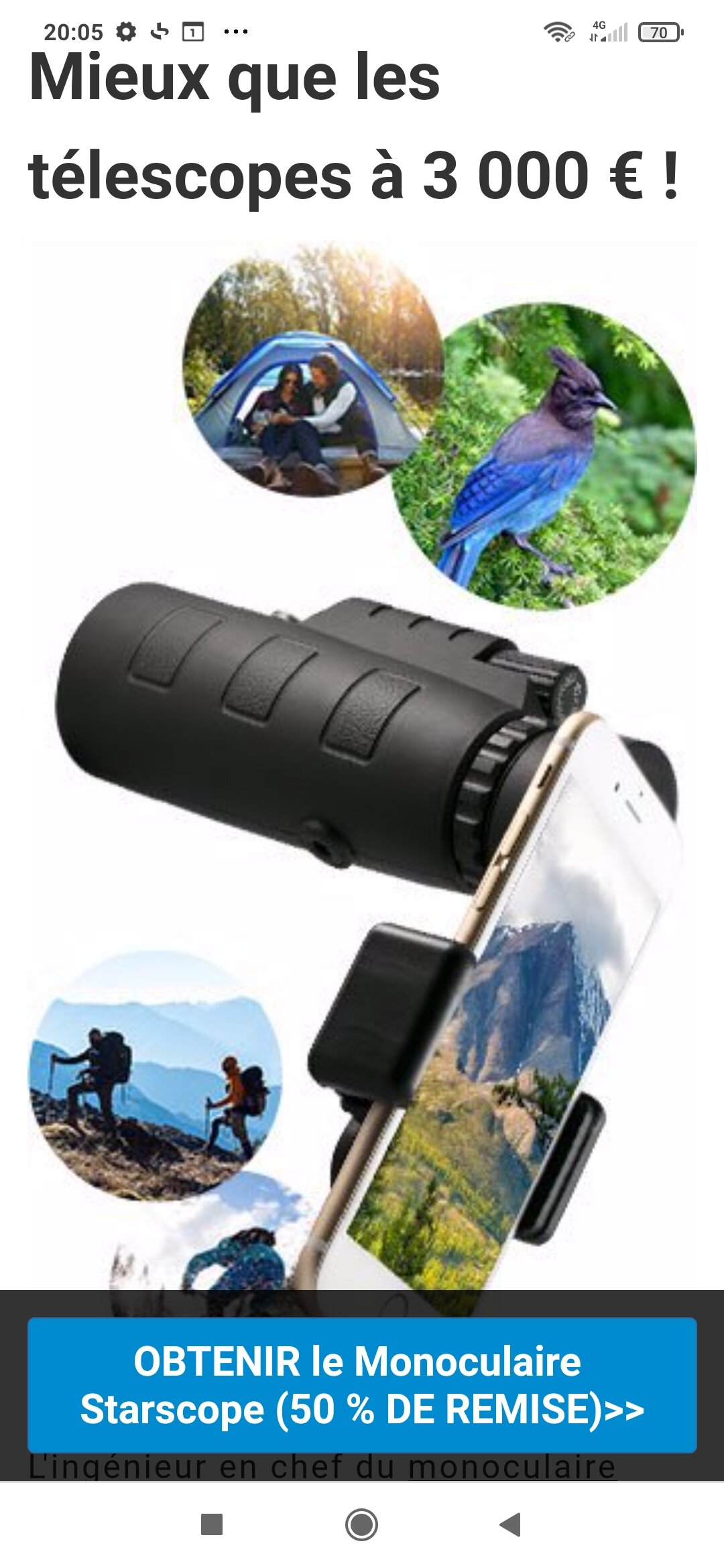 Je crois que j'ai trouvé des champions du monde. C'est pas une PA mais un site commercial. J'avais en fond sonore de la musique par youtube et avec les inévitables pubs y'a une longue vidéo qui se lance pour promouvoir un monoculaire. Entre autres miracles y compris astronomiques, il grossirait 30x plus que les équivalent du commerce et malgré ses 50 euro il serait plus performant qu'un télescope à 3000 euro. Evidemment c'est tout du long du pipo mais par curiosité je clique le lien, 30x plus que les 10x habituels sur du +/- 50mm, y'a de quoi se demander jusqu'à quels mensonge les vendeurs sont prets à aller. Et j'ai pas été déçu...