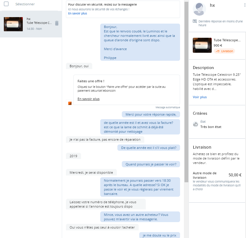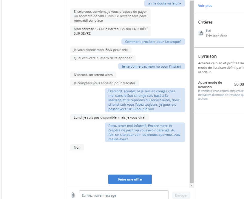 Oui, et moi aussi, sur le ton de l'humour, je lui avait proposé d'aller en Gendarmerie, et il avait invoqué l'illégalité du paiement espèce... En attendant je comprends que le "second acheteur" dont il m'avait parlé lui a fait faux bon.