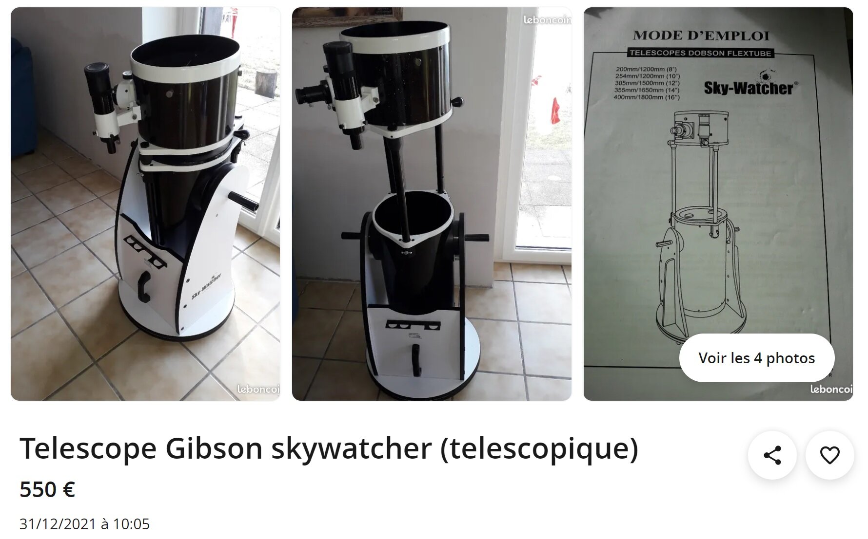Cela étant (mais évidemment si en bon état), cet Orion 200 mm sur monture SVP vendue neuve à 800 € (Telescope reflecteur à EQ Orion SkyView Pro 8") pourrait être à 450 € un achat assez correct pour un petit budget .