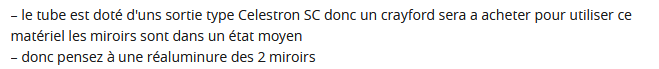 – le tube est doté d'uns sortie type Celestron SC donc un crayford sera a acheter pour utiliser ce matériel les miroirs sont dans un état moyen – donc pensez à une réaluminure des 2 miroirs