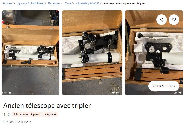 https://www.leboncoin.fr/image_son/2206805416.htm  enfin si quelqu'un est de Reims cette annonce là passe innaperçue et pourtant ce tte lunette est une 80mm f11 si j'ai bien lu sur un lien en recherche il s'agit d'une RET47 qualtées optiques inconnues peut etre en lui demandant un envoi avec élégance ?Lunette astronomique (image 1)alors qui sait si  à la fin de  l'envoi il  touche