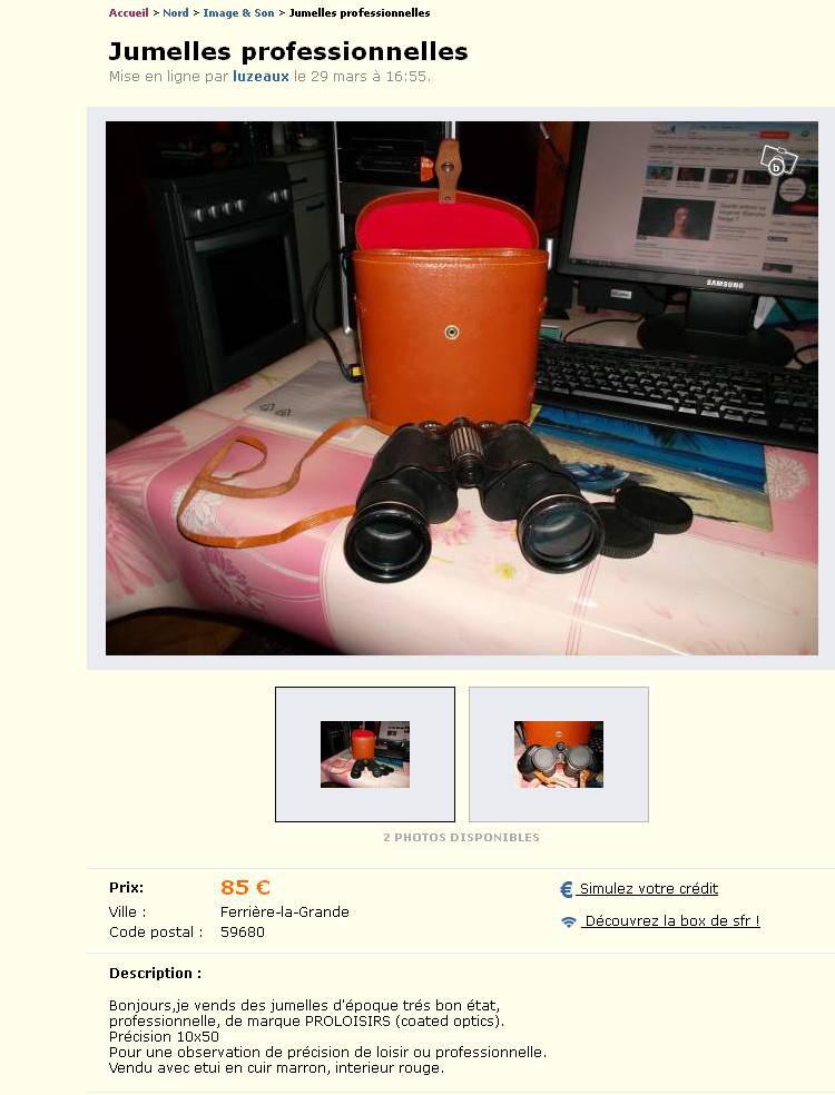 Jumelles "professionnelles" de marque "Proloisir" (de la daube mais le mec a mal pris que je lui signale que ces jumelles n'avaient rien de pro du tout et sa réponse -qui se passe de commentaire- :be: : "VA TE FAIRE METTRE TU DIRAS MOINS DE CONNERIE, fils de pute et ca tu rigole !!!! batard!!!"
