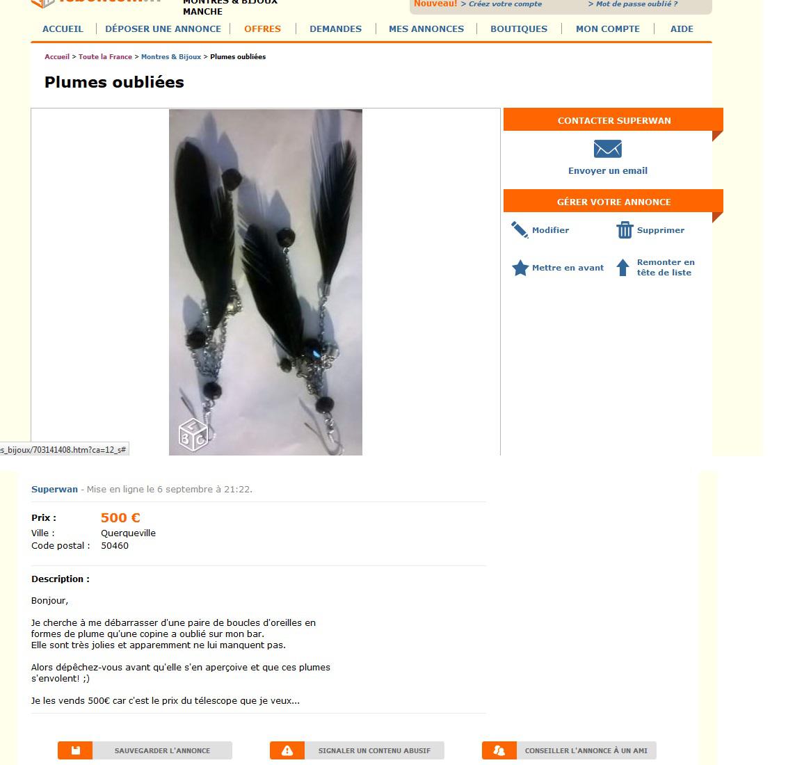 Je cherche à me débarrasser d'une paire de boucles d'oreilles en formes de plume qu'une copine a oublié sur mon bar.