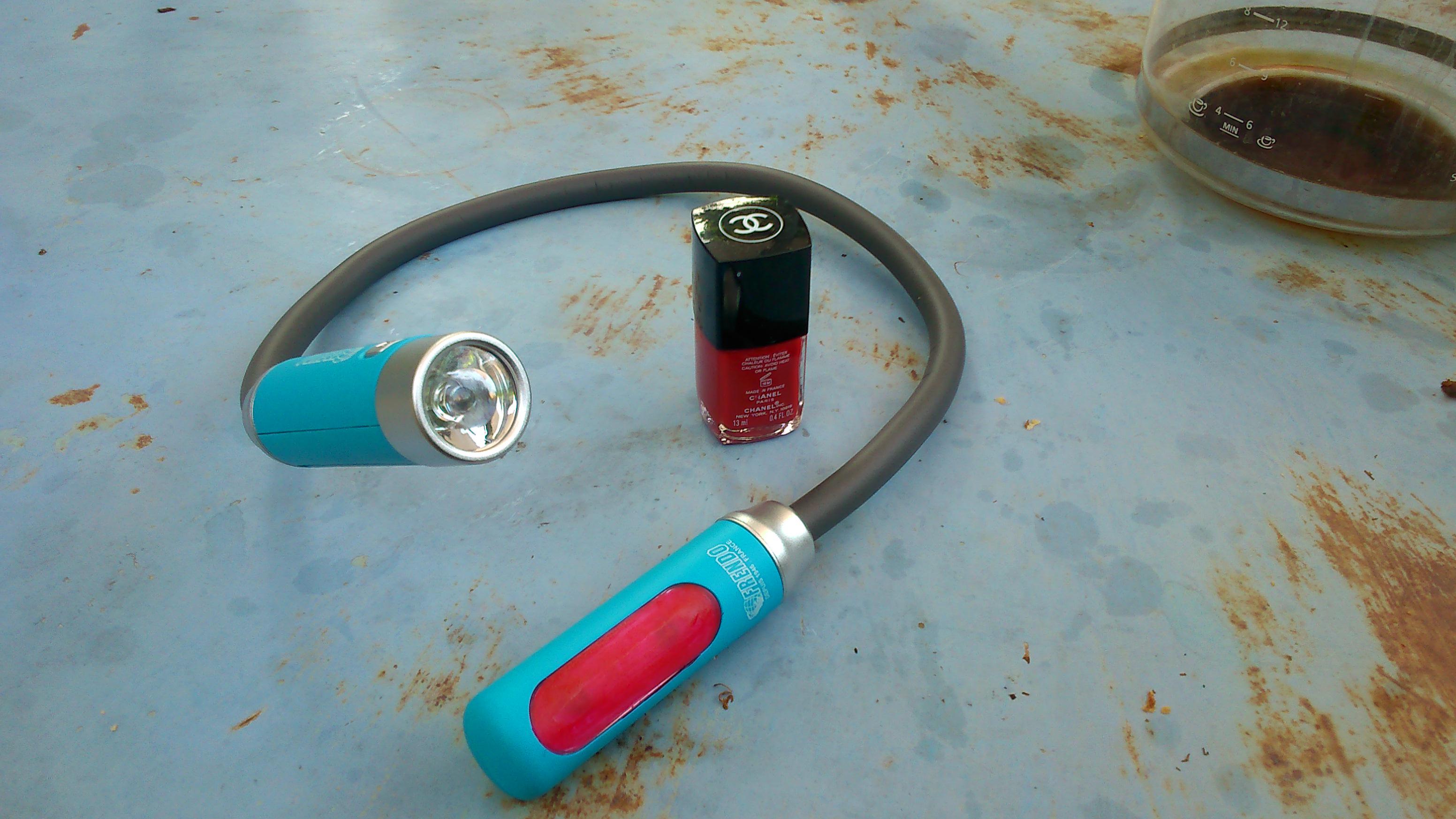 La tige souple entre les deux lampes est assez grande pour la passer autour du cou: un coup de vernis à ongles sur la lampe large et on a un truc qui s'oriente facilement ou l'on veut, laisse les mains libres et dérange moins qu'une frontale (on n'a pas le flux dans l'oeil et on n'éblouit pas les potes, contrairement à la frontale qui en plus interfère avec les oculaires, le viseur, la paire de lunettes etc...).