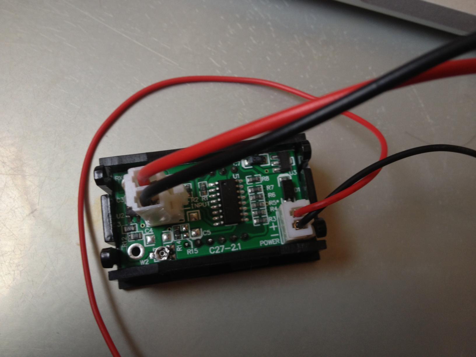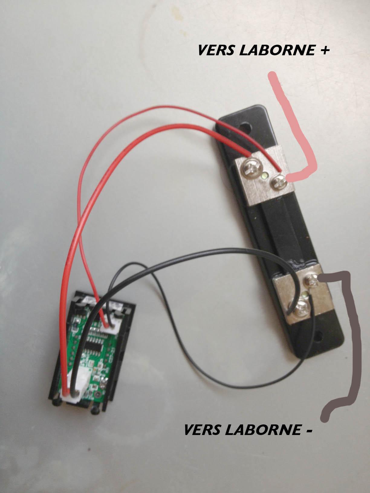 Il y a l'alimentation de l’électronique (contrairement au voltmètre qui se branche sur la tension de la batterie l’ampèremètre ne "voit" d'une toute petite tension), et 2 fils qui sont reliés aux 2 vis plus petites sur le shunt.