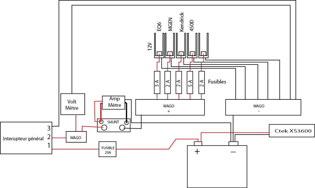 le coffret de fusible fixé sur un bord, l'amperemetre entre la batterie et la boite a fusibles et le volmetre aux bornes de la batterie.