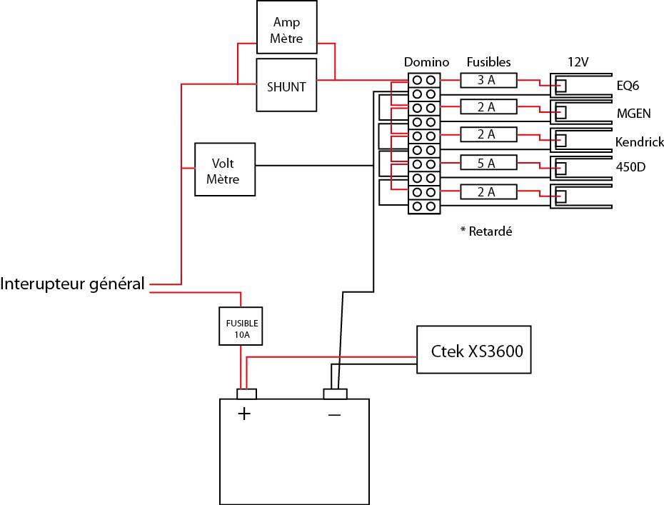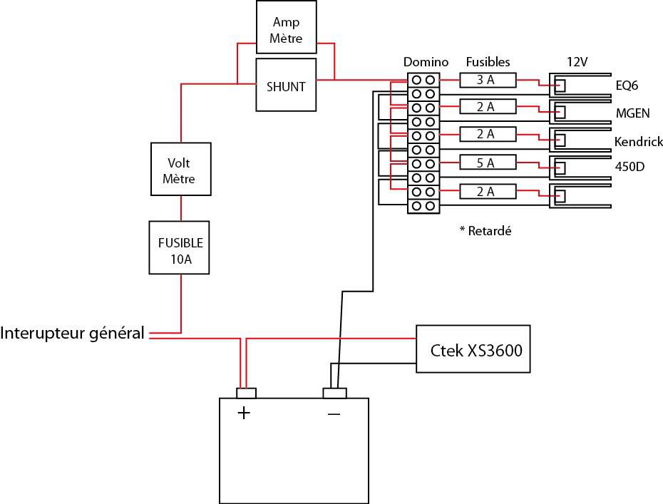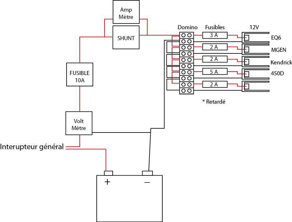 Quand au branchement du voltmètre il suffit de le mettre entre le fil rouge et le fil noir, après le coupe circuit et le fusible, mais avant l’ampèremètre.