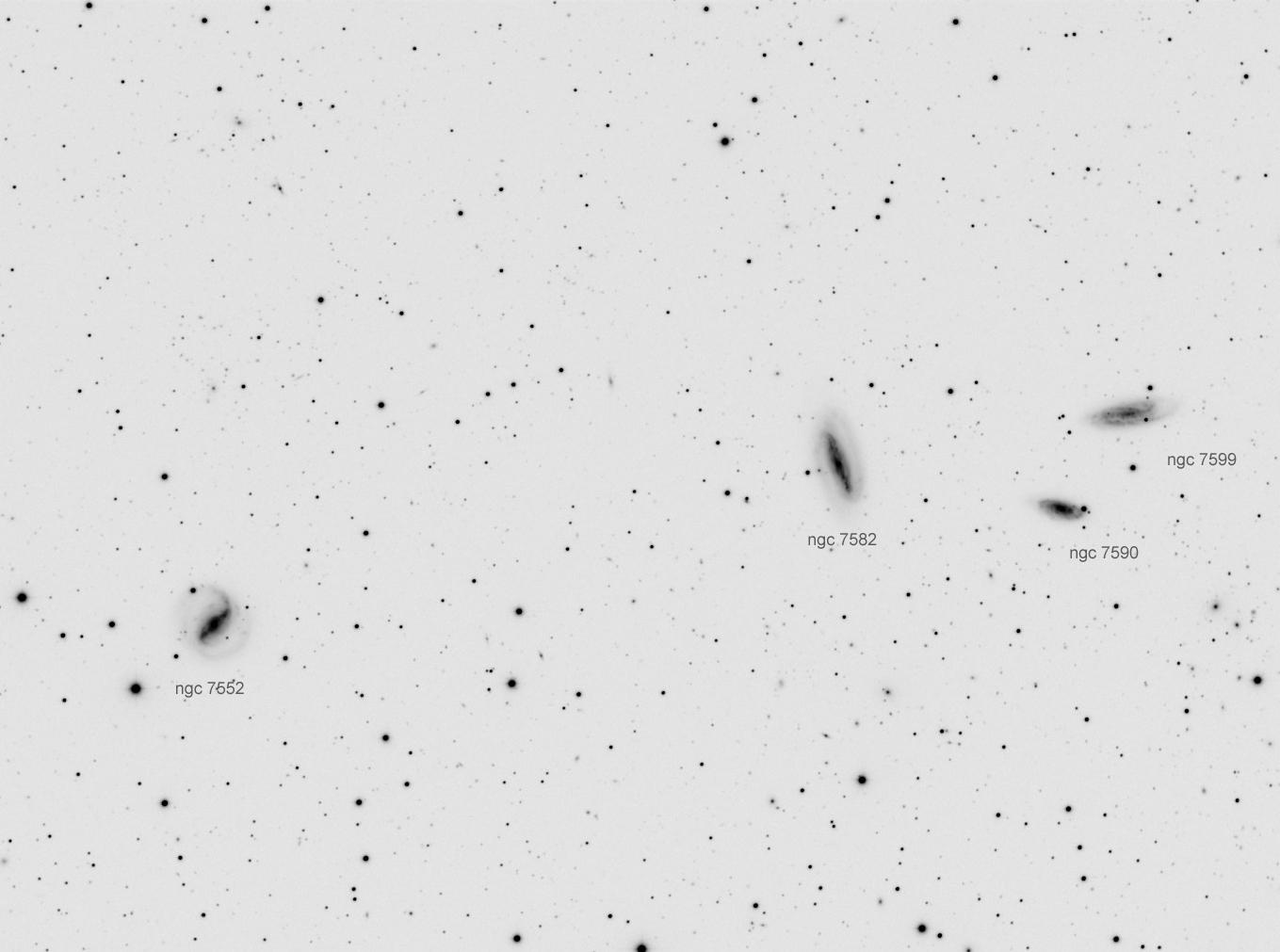 Voilà les images réalisées cette nuit dans l'ordre chronologique. (j'ai mis un négatif annoté pour repérer les voisins les plus importants; traitement Astroart, DOF...)