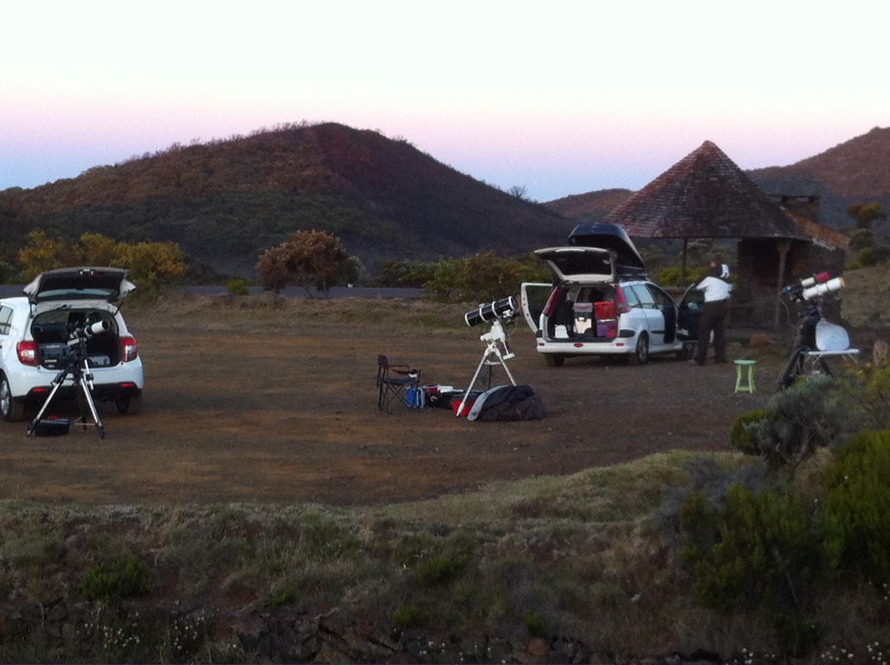 On s'installe sur l'aire de pique-nique près du Piton Textor vers 17H; heureusement qu'on est arrivé tôt avec Yonafunu, Gérard T., Syberia38 et 2 invités. Sinon, le site était pris d'assaut par le pique-nique du dimanche. (Chez nous, il y a des éclaireurs qui réservent les emplacements dès la veille).