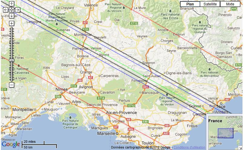 Traits bleu=bande centrale, traits rouge= bande d'incertitude et les 2 bandes grisées servant au positionnement sur le relief lunaire pour les occultations rasantes (qui n'ont rien à faire ici il me semble).