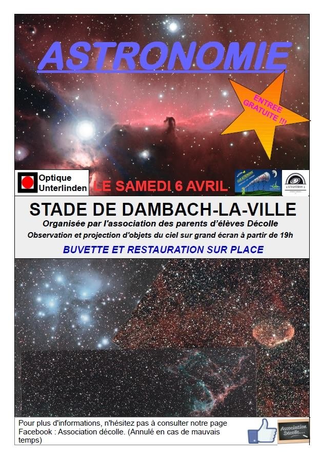 L'association Décolle vous invite le samedi 6 avril à la première soirée astronomique de Dambach-la ville qui aura lieu sur le terrain de foot du village.