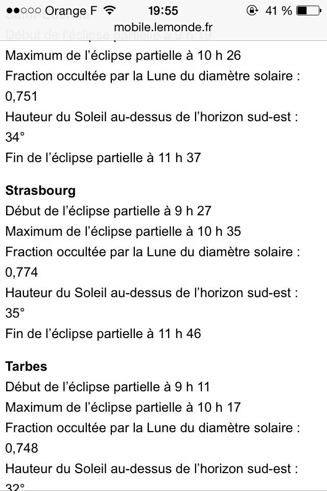 Alors au final j'ai téléphoné à mes parents qui habitent un trou perdu au fond d'une vallée sudiste : Storckensohn. Et ma mère était désespérée de ne plus trouver de lunettes éclipse :b:...:o Oh mes vieux parents s'intéressent à l'astro, je suis scotchée :b: Comme je suis sur-équipée en astrosolar, je vais en faire profiter mes vieux, et mes jeunes aussi qui n'iront pas à l'école demain :be: