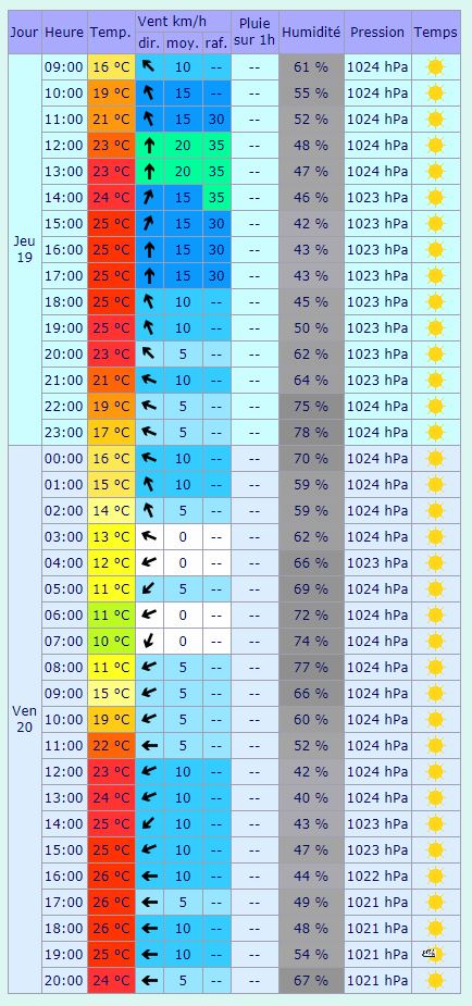 20:00 15 °C 15 Nord : 0 ° 10 -- -- 83 % 1016 hPa Couvert