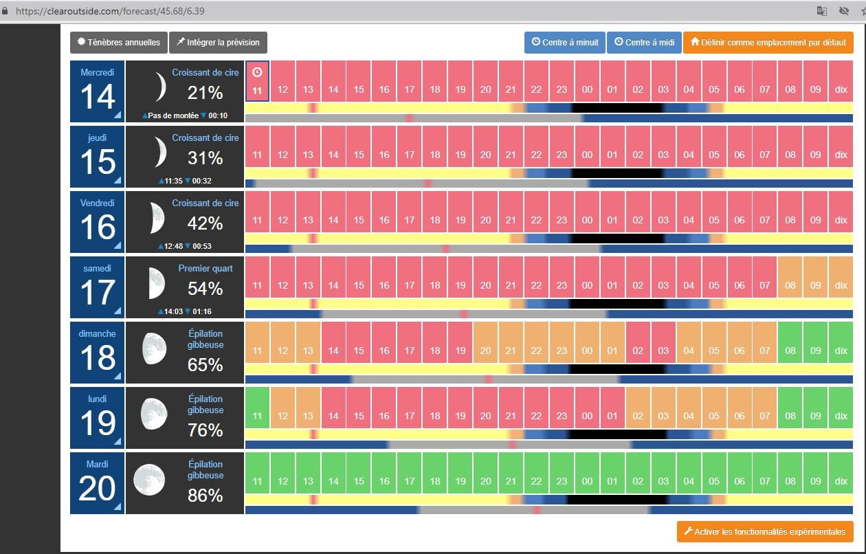 Si vous ne connaissez pas ce site de prévisions pour l'astro (Clear Outside) et pour faire simple, en rouge: pas bon pour l'astro, en orange: moyen, en vert: bon. Vous pourrez remarquer que plus on se rapproche de la pleine Lune plus les conditions s'améliorent...