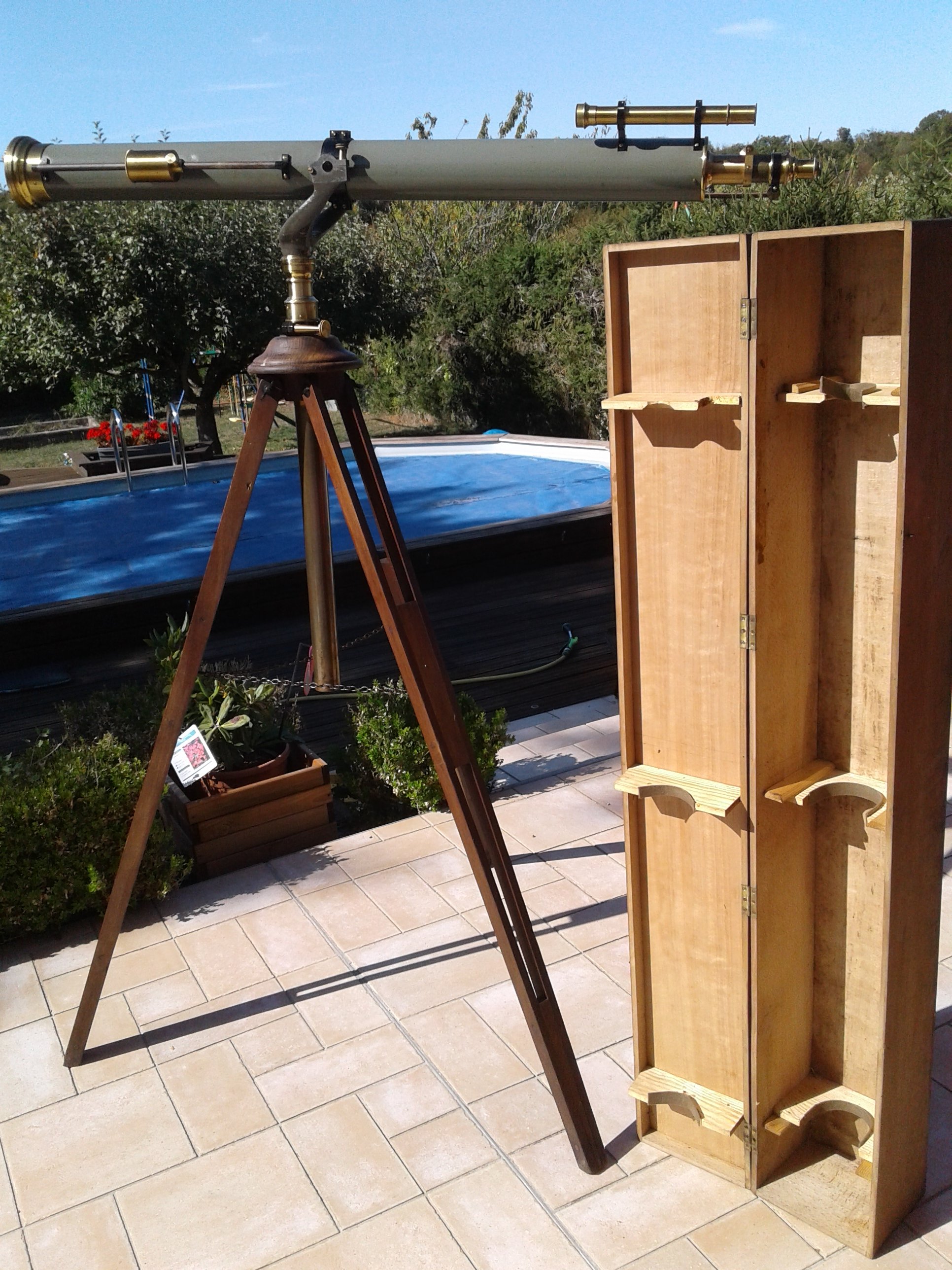 Une sublime Manent, à 5km de chez moi, je suis allé la voir, étonnant à quel point elle est en bon état. Malheureusement trop onéreuse pour moi et prix non négociable. C’est une 95mm, il manque des vis au chercheur, mais sinon tout est là : caisse, trépied, bouchons, hélioscope, filtre neutre variable, 3 oculaires. Bref, pour moi trop cher, mais sublime vieille lunette !