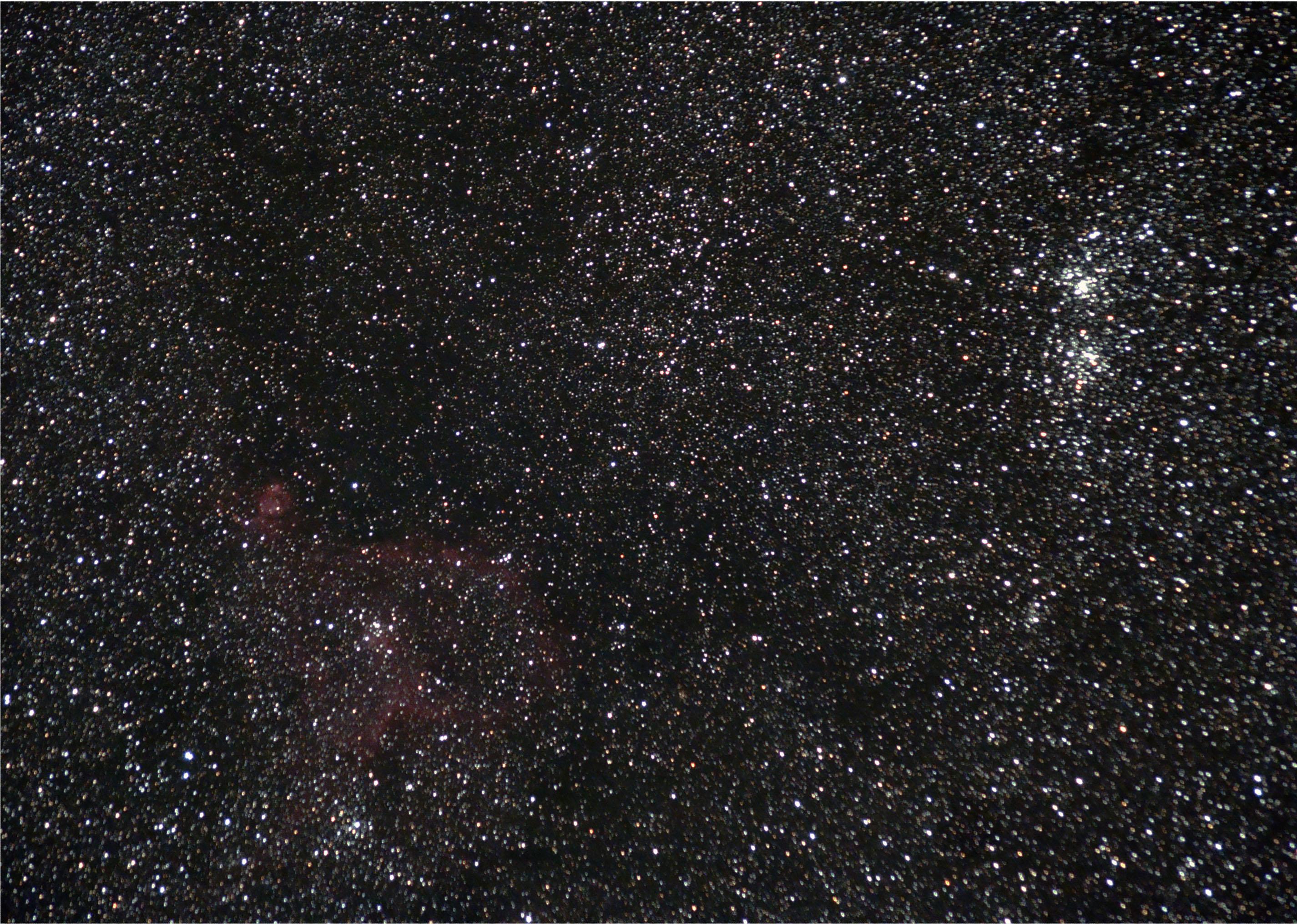 Sur cette image, on peut voir le Double Amas de Persée (en haut à droite) et la nébuleuse du Cœur (IC 1805).