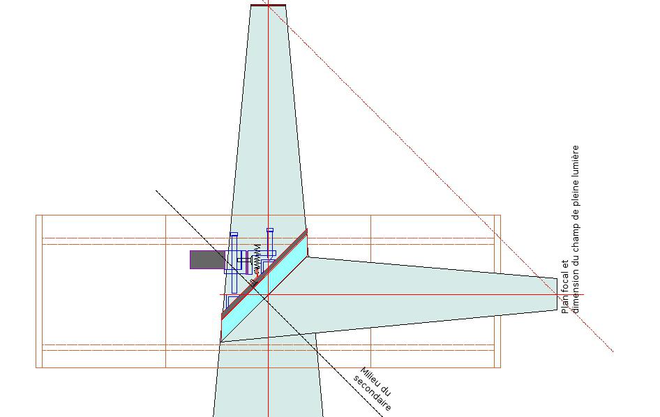 En dehors du problème de ton miroir mal collé, un tirage correct ne suffit pas. Avant de recoller ton secondaire, tu pourrais aussi t'assurer qu'il n'y a pas (trop) de vignettage et que les différents éléments sont bien alignés. Cela peut se faire par calcul ou avec certains logiciels ou encore en dessinant une esquisse à l'échelle 1. Voici un exemple. Cela permet de positionner correctement le secondaire sur la plaque de l'araignée (dans l'axe optique) et de positionner l'araignée dans la cage secondaire une fois que l'on a fait ses choix de champ de pleine lumière et de tirage.