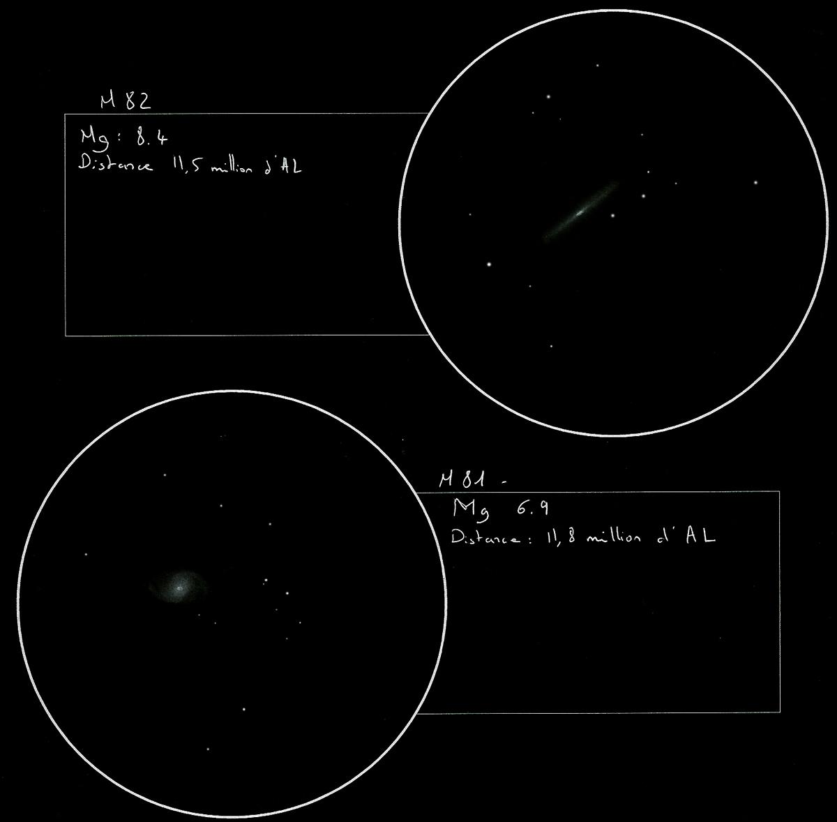 Je referais M82 sans lune pour en trouvé les bonnes proportions ! Will, pour les bras spiraux de M81, je ne dirais pas que je les ai vu, c'était plus une "sensation" en vision décalée, j'aurais du les faire plus léger encore sur le dessin.