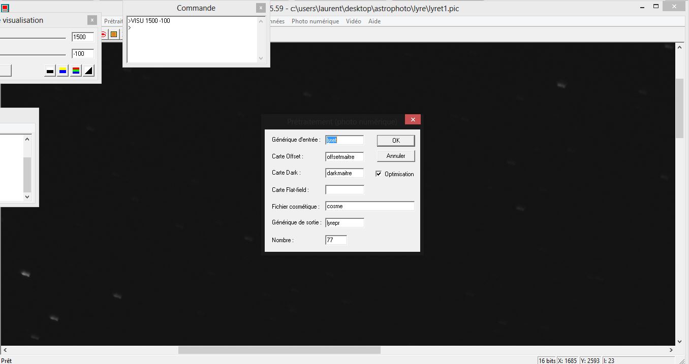 Quand fais mon prétraitement, dans l'odre, je charge mon image , je fais un carré dans une zone sans étoile, je clique photo numérique , prétraitement, je rentre les noms, mon générique de sortie je le nomme lyrepr.