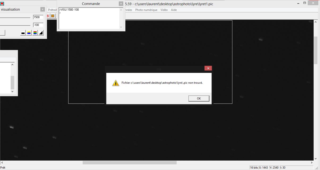 Ensuite tu t'en serviras comme d'un flat. Elle est là l'erreur. Iris ne cherche pas le fichier lyre.pic ! Il cherche le fichier ".pic" dans le répertoire lyre : regarde bien le \ qui se trouve entre lyre et .pic ;) il recherche donc un fichier sans nom et c'est justement le flat qui manque à l'appel.