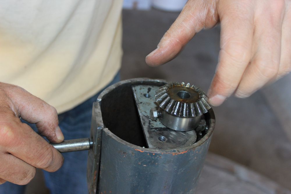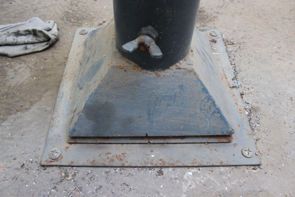 Dans la coupole se trouve un solide pied colonne en acier. Sur le côté, 3 vis: Une en haut actionnable à l'aide d'une clé de type "démonte roue" (celle là même utilisée pour descendre les 4 vérins de stabilisation de la remorque).