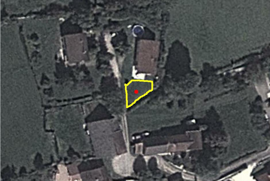 Ton idée est super sur le fond (pratique, déjà tout fait, résistant etc...) c'est même l'idéal ; mais sur la forme l'abri va être pile poil au milieu du terrain, normal c'est là ou c'est à peu près dégagé, devant la maison (point rouge) :