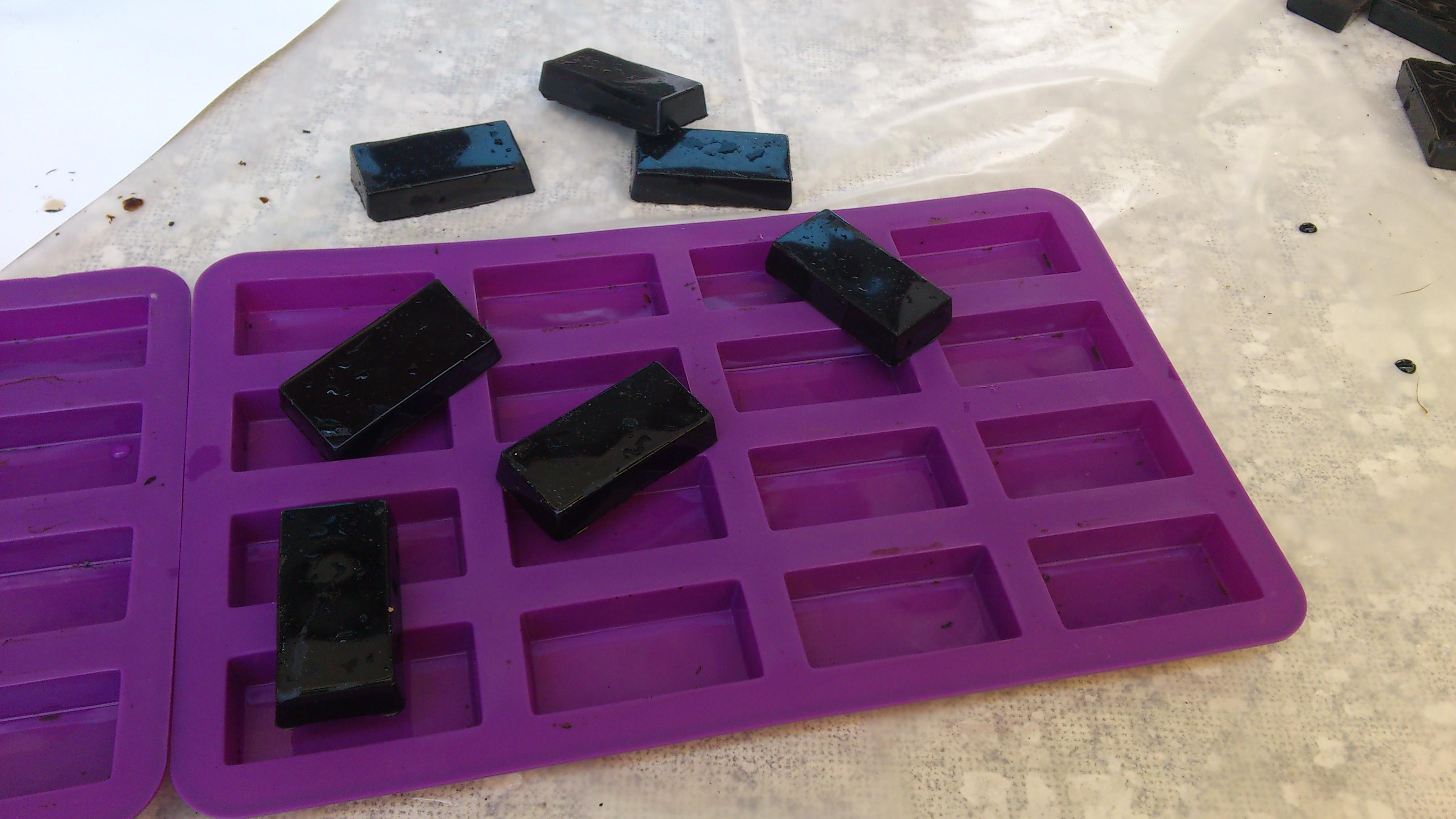 Pour les carrés de poix, je les ai coulés dans un moule silicone trouvé au rayon des cuisinières, ils font 25x50x10 mm, puis coupé en deux pour obtenir 2 carrés de 25mm de cotés. Je les ai espacés de 10mm. S'ils ne sont pas parfaitement alignés c'est pas grave, au contraire...