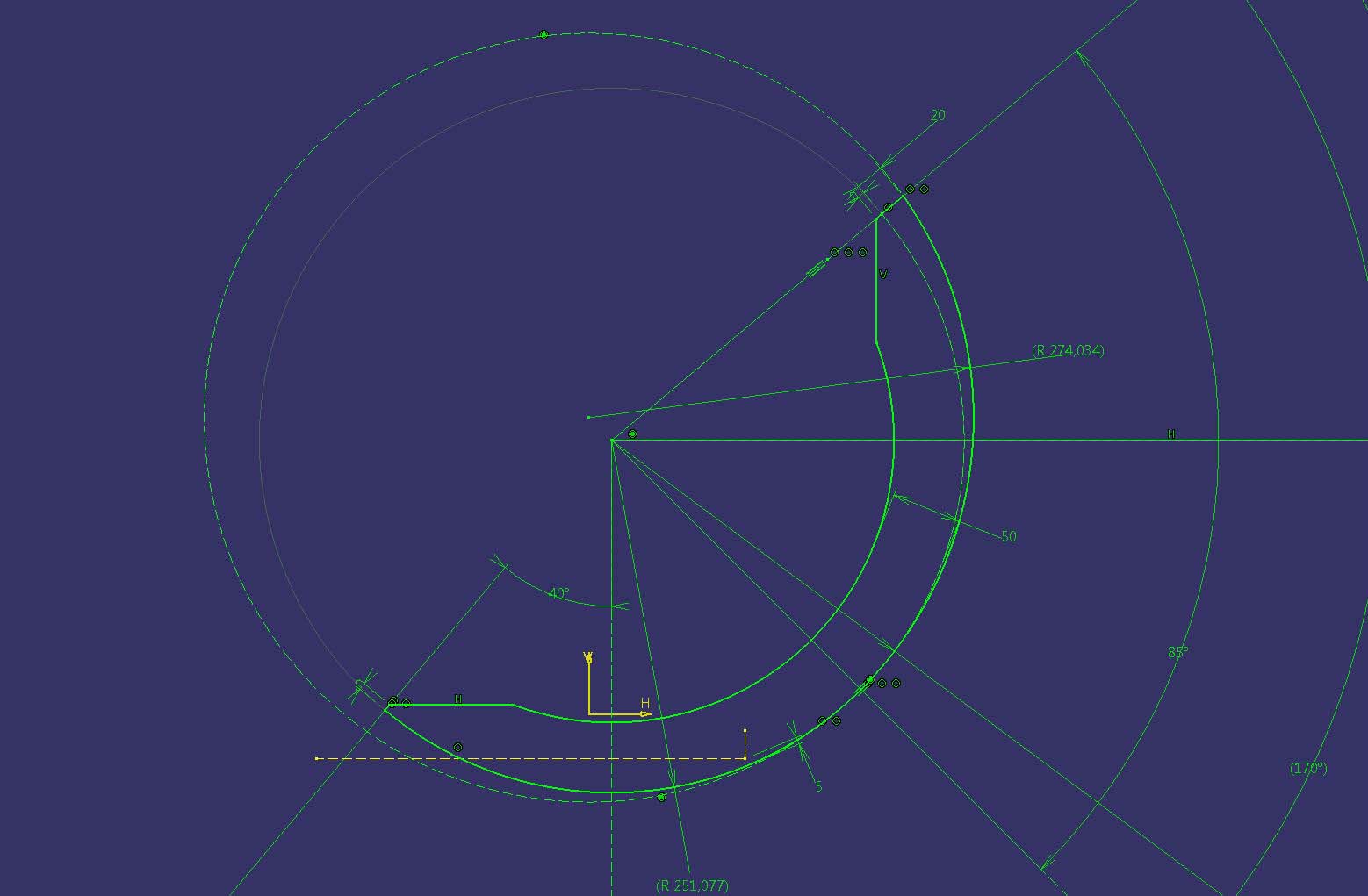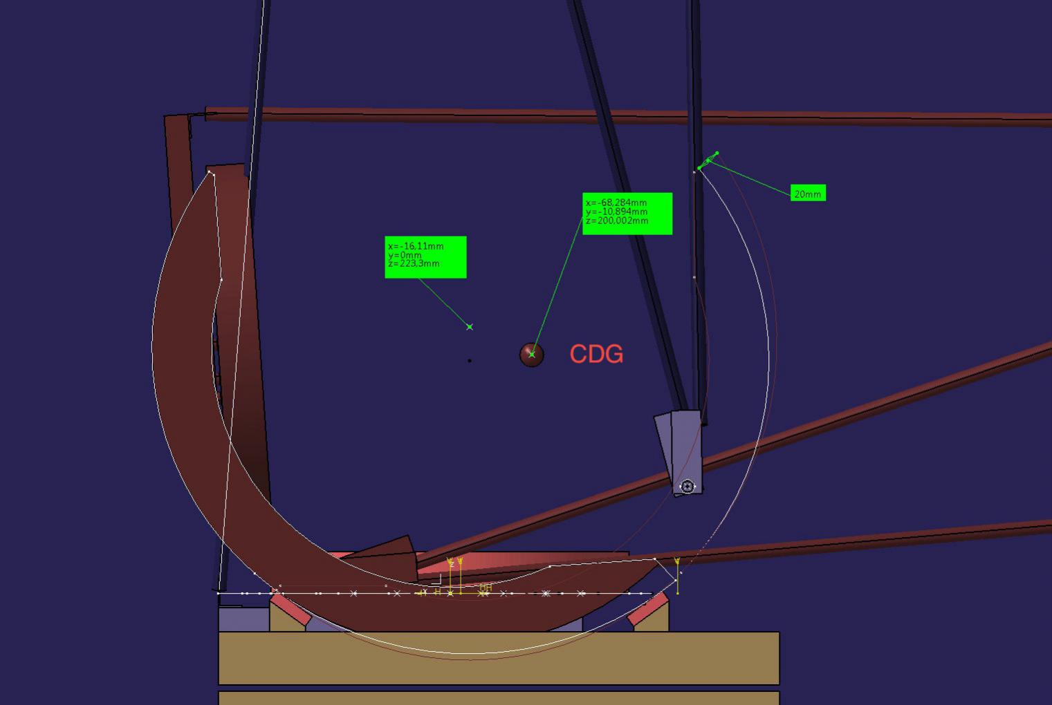 Petit rayon r 251 mm, grand rayon R 274 mm, c’est juste pour voir le comportement du système, (je n’ai pas encore la masse de tous les éléments donc les rayons sont loin d’être figé !).