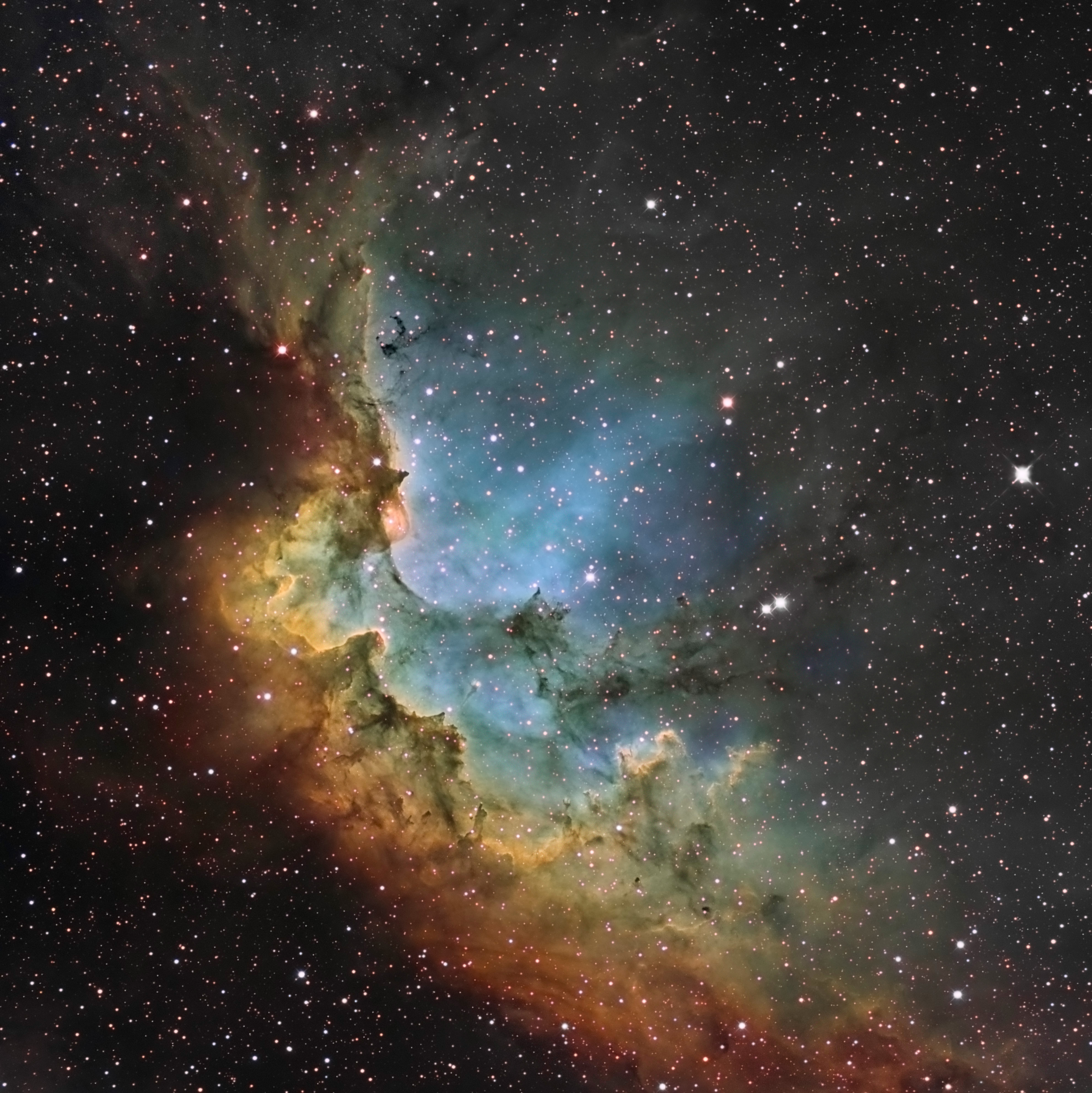 J'ai rebossé ma luminance , j'ai refait le stacking, traitement linéaire, montée des histo progressive, traitement des détails par additions de calques avec traitement individuel, plutôt que cumul de traitement sur un même calque, déconvolution des etoiles avec deringing et wavelet en 150 passes (itération) 32 minutes de calcul mais un résultat qui me plait bien. retravaillé les teintes.