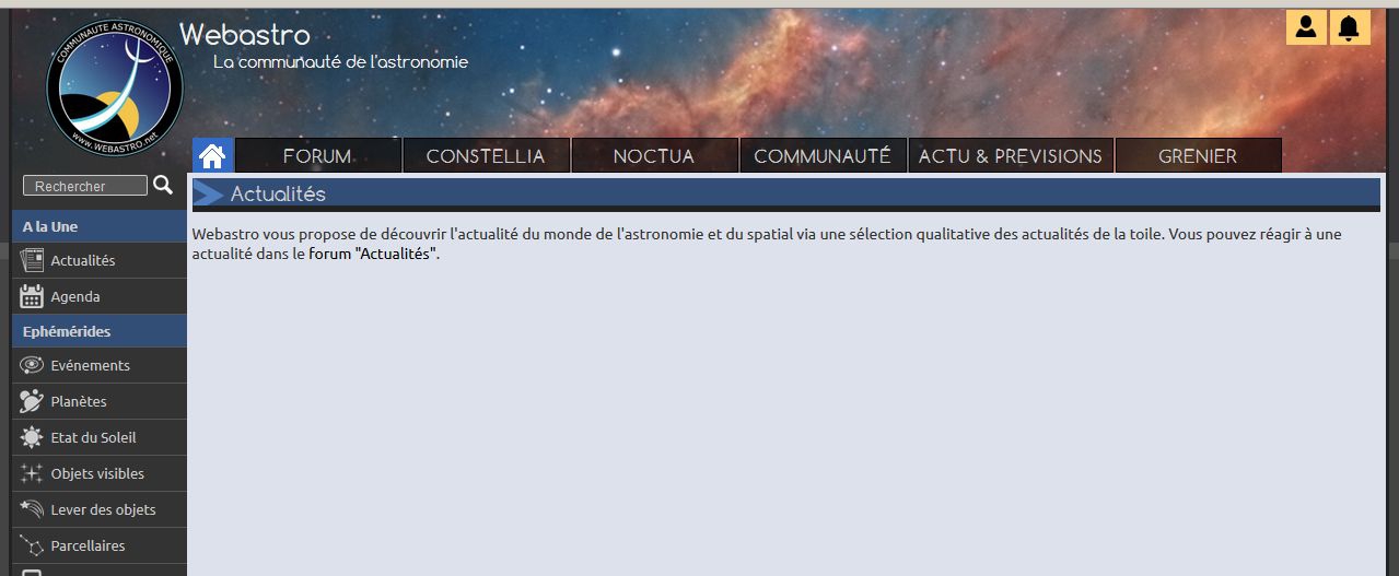 "Webastro vous propose de découvrir l'actualité du monde de l'astronomie et du spatial via une sélection qualitative des actualités de la toile. Vous pouvez réagir à une actualité dans le forum "Actualités"."