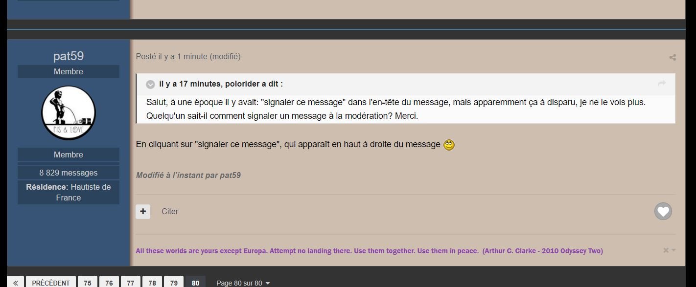 Merci @pat59, c'est bien ce que je pensais: on n'a pas la même page :b:.  Toi tu as bien le "signaler ce message" et moi je ne l'ai pas... :o. Les mystères de l'informatique :be:. Bon faut que j'essaye de trouver quelqu'un pour me dépanner. Allô la Terre, ici fusée lunaire, est ce que vous me recevez :)? Peut-être mon navigateur? Si quelqu'un peut résoudre mon problème, un grand merci ;).