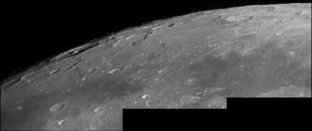 Le début du limbe, partie gauche commence avec ce très beau cratère de Pythagore de 130 km de diamètre avec des remparts de 5000 mètres d'altitude et le piton central de 1500 mètres (là on se fait tout de suite une idée sur la taille). Mosaïque de 3 images avec un crop pour supprimer les escaliers disgracieux, (la version non cropée est visible ici :http://i1237.photobucket.com/albums/ff476/aenigmaforce/derdederpanoescalier_zps34a8641f.jpg~original) Avec la libration non favorable, on se retrouve avec un cratère vu de face ! puis dans l'ordre vient Anaximander, carpenter, Anaximenes et le dernier cratère visible sur la droite (forme circulaire) est Philolaus.