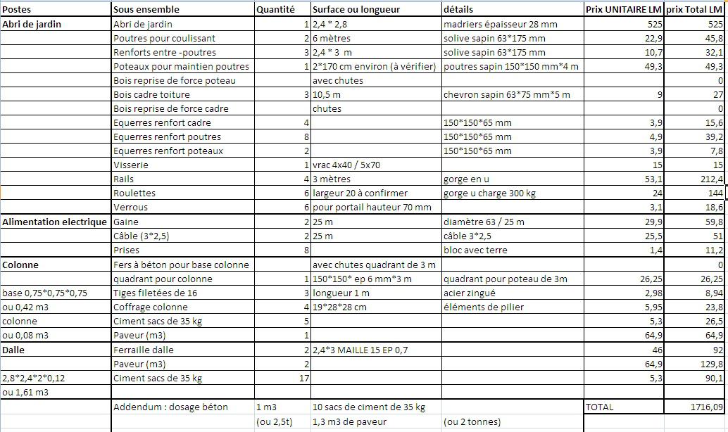 Le chiffrage concerne pour l'instant l'abri astro uniquement, cad l'abri en lui-même, la modif du toit pour qu'il roule (donc rails, roulettes, structure), la colonne béton, l'alim électrique et la dalle (qui est prévue du double de la surface initiale permettant ainsi à la fois d'accueillir les poteaux de maintien de la structure avec les rails ainsi que le futur abri de jardin qui sera accolé à l'abri principal dans un second temps)
