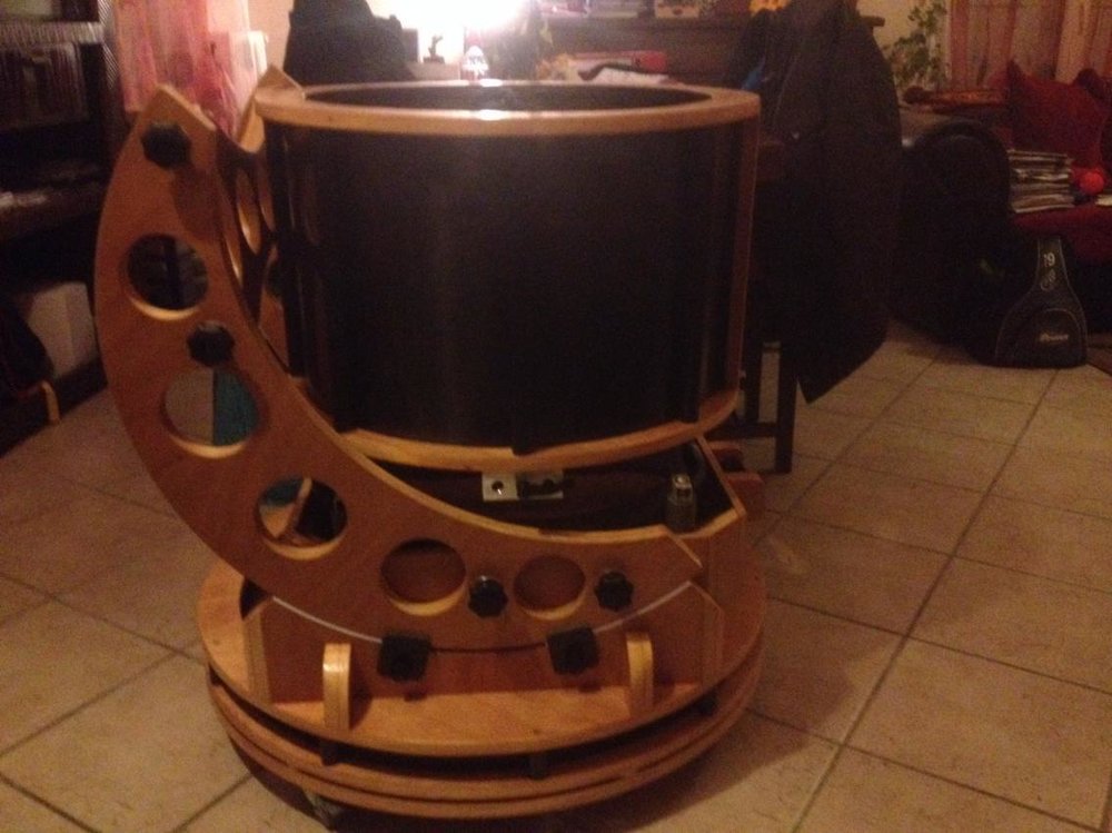 Merci à tous , le ciel a été clair une demi - heure pas plus , mais ça m'a suffit pour le test , sachant qu'il est pas encore vernis et que l'humidité tombe vite , j'ai tout vite rentré , aucun soucis d'équilibrage , sachant que je n'ai pas mis le chercheur , j'ai un antares 12x80 , pour le poids alors 26 kg pour le primaire et le caisson avec le barillet ,9.7 kg pour l'embase et 8,5 pour la cage secondaire ( avec le chercheur ) ce qui me fait moins de 45 kg ,pour un 500 ce n'est pas trop mal , surtout que tout est démontable , pour l'embase qui est en deux parties , la rotation se fait avec des rondins de teflons de 60 MM de diamètre pour 4 d'épaisseur . Merci