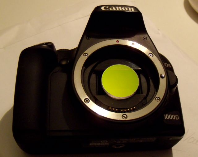 Au final, j'ai adapté un filtre SkyGlow Astrophotography 1"1/4 en l'enlevant de son porte-filtre, soit 28mm de diamètre utile pour le coller via du scotch double-face fin directement sur le boîtier. La face sensible (réfléchissante) étant normalement coté objectif.