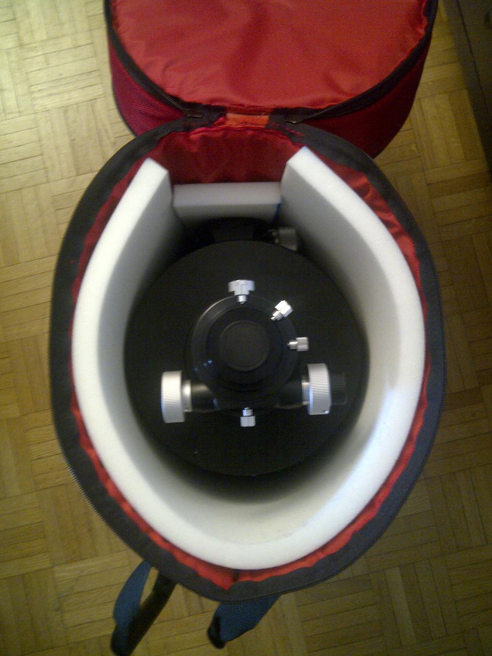 L'avantage c'est que tu peux y glisser pas mal de matos en plus (chercheur, raquette, oculaires...). J'y glisse même les poids de ma monture conditionnés eux aussi dans du tapis de gym (poches à chaque extrémités donc sac équilibré !!!)